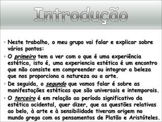 1) O documento discute vários pontos sobre estética, incluindo o que é uma experiência estética, manifestações estéticas universais, e períodos significativos da estética ocidental como a Grécia Antiga e o Romantismo.