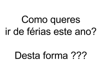 O documento discute as opções de férias deste ano e como elas são difíceis de decidir devido ao aumento de impostos e congelamento de salários, sugerindo que a única maneira de ir de férias é ganhar na loteria.