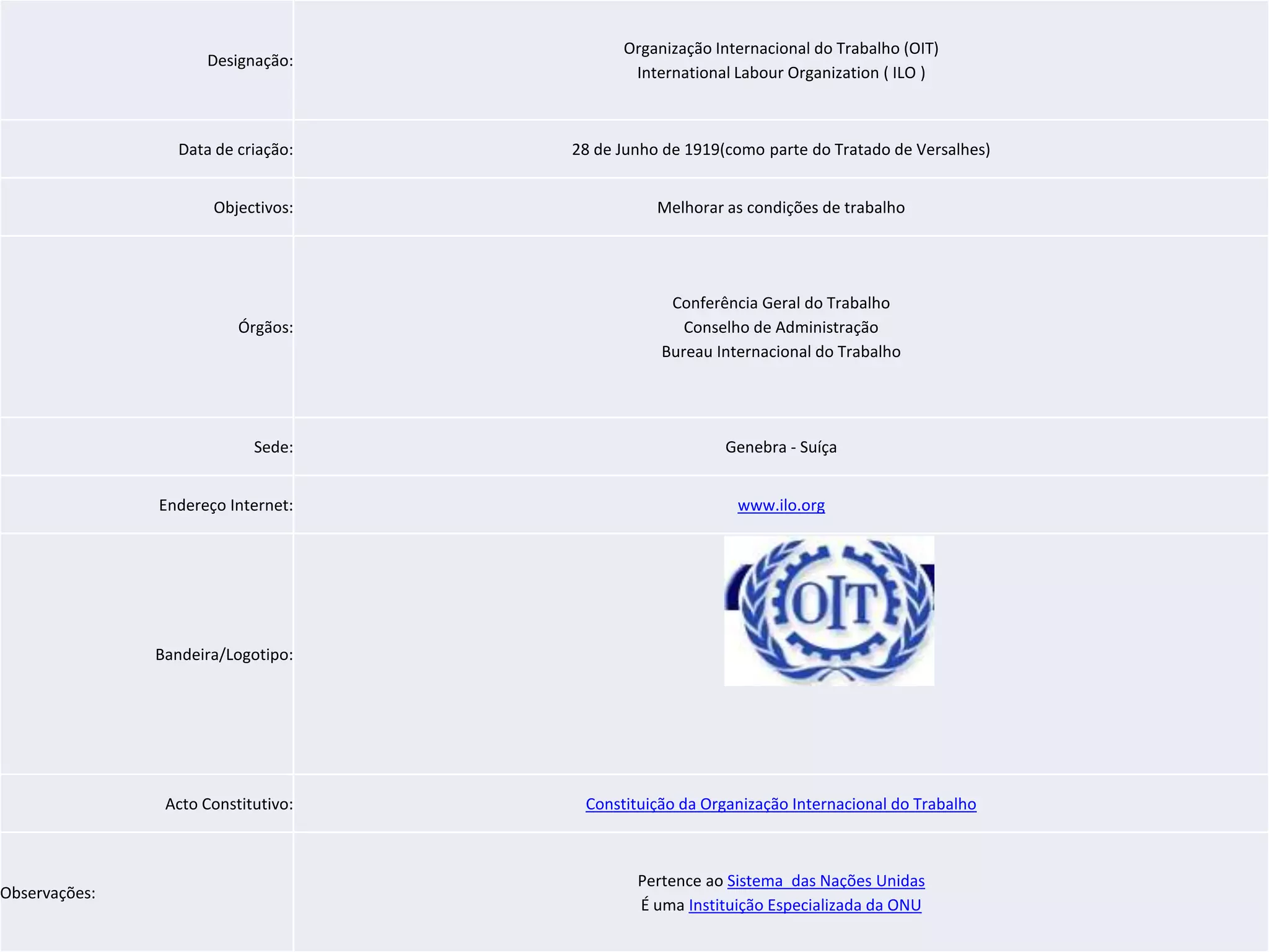 A OITA OITé uma agência especializada nas questões do trabalho, esta agência está ligada á ONU, a OIT está presente em 178 Estados membros e em organizações de empregadores e de trabalhadores.Esta agência foi criada com o objectivo de melhorar as relações de trabalho.