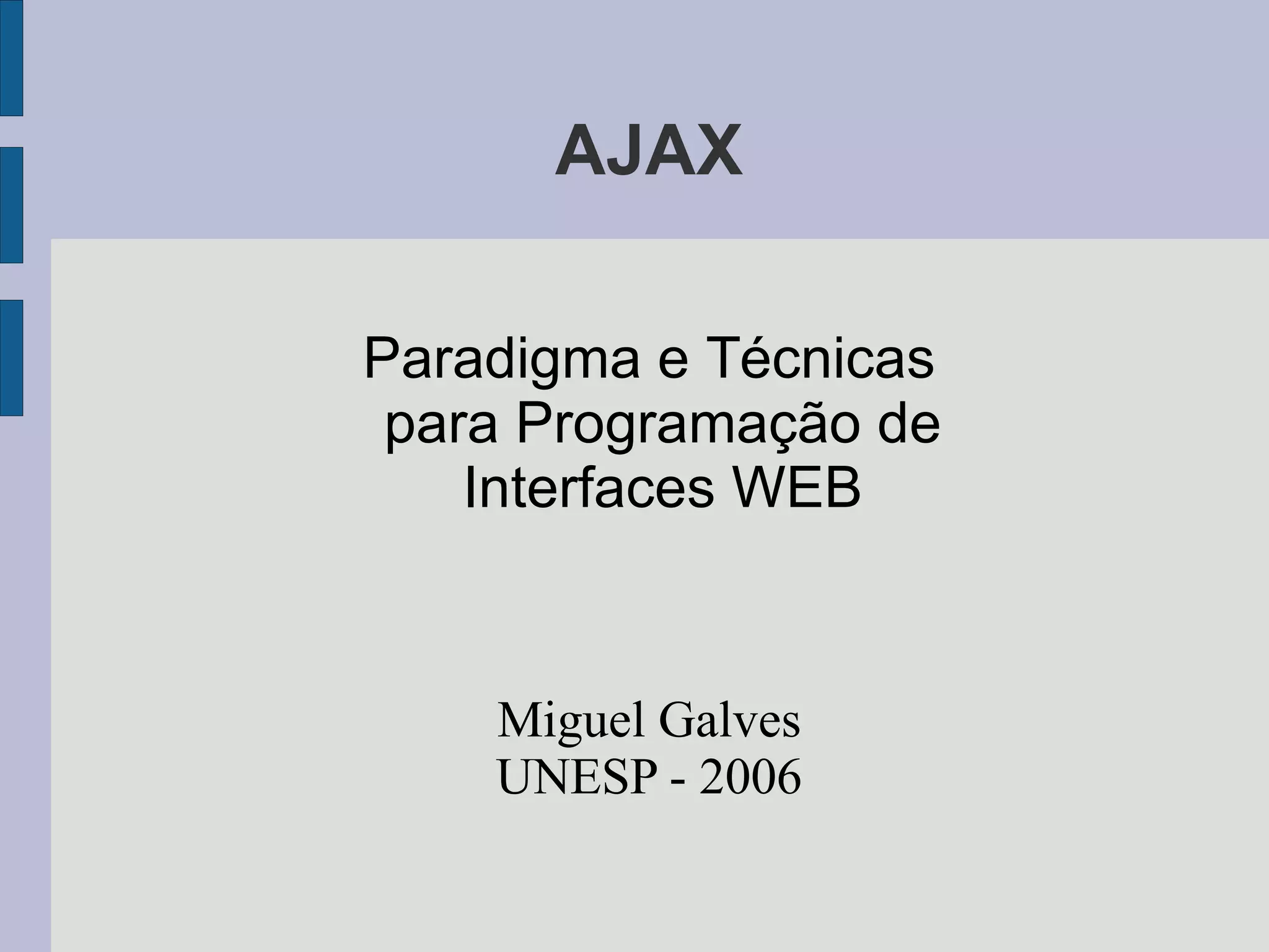 O documento apresenta um histórico da web, como evoluiu a arquitetura de sites e a introdução do AJAX. Explica que AJAX utiliza tecnologias já existentes como JavaScript, XML e HTTP para permitir atualizações assíncronas na página e maior interatividade. Também destaca os desafios do desenvolvimento com AJAX, como compatibilidade entre navegadores e a necessidade de implementar mecanismos como histórico de navegação.
