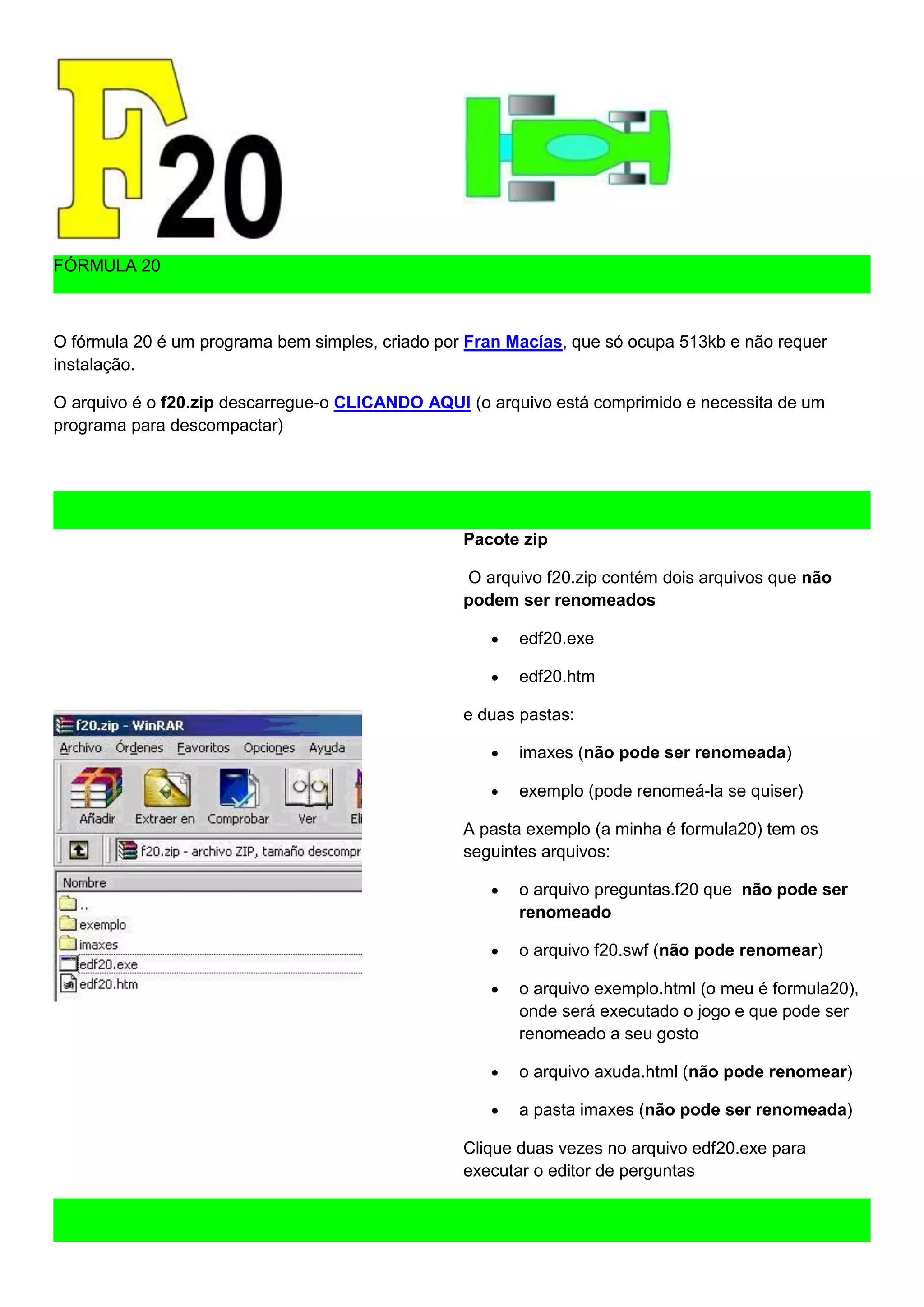 O documento descreve o programa Fórmula 20, um jogo educativo leve de perguntas e respostas que pode ser executado em um navegador web. Ele inclui um editor de perguntas para criar grupos de perguntas e configurar parâmetros como ordem das perguntas e tempo de resposta. O objetivo do jogo é acertar 20 perguntas consecutivas antes que o tempo acabe.