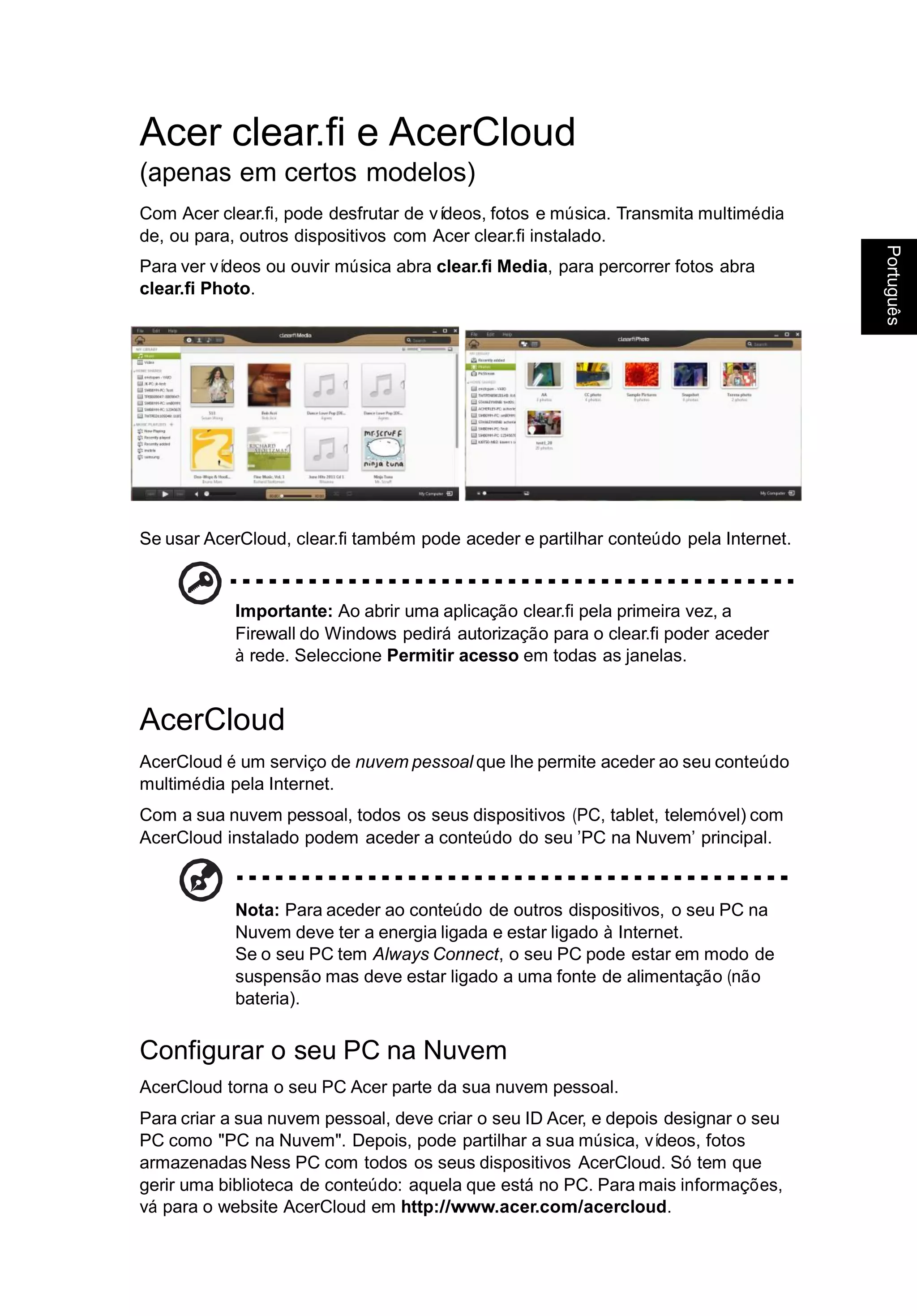 O documento descreve o serviço AcerCloud, que permite aos utilizadores aceder e partilhar conteúdos multimédia através de dispositivos com a aplicação Acer clear.fi instalada. Os utilizadores podem designar um dos seus PCs como "PC na Nuvem" para armazenar e partilhar conteúdos com outros dispositivos. A aplicação PicStream envia automaticamente fotos tiradas nos dispositivos móveis para o PC na Nuvem.