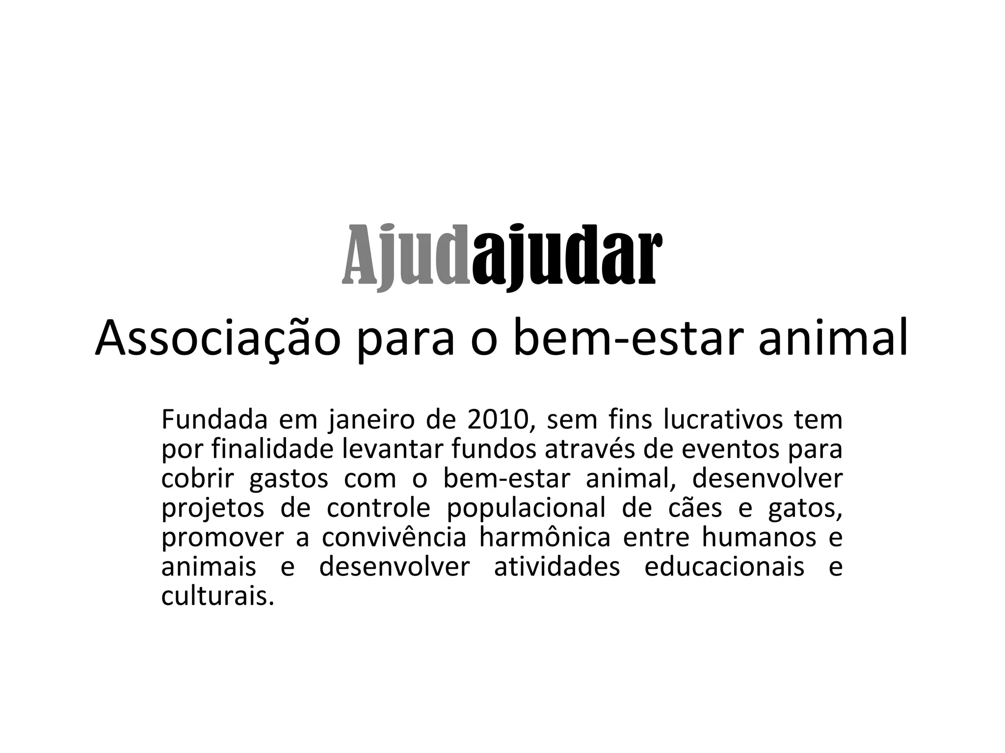 A Ajudajudar é uma associação sem fins lucrativos fundada em 2010 que levanta fundos através de eventos como jantares, bingos e bazares para financiar projetos de bem-estar animal, como castração e controle populacional de cães e gatos. A associação também promove a educação sobre animais e parcerias com o poder público e clínicas veterinárias.