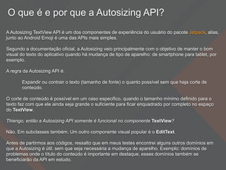 A Autosizing TextView API do Android Jetpack visa manter a legibilidade do texto em diferentes dispositivos, ajustando seu tamanho sem cortar conteúdo importante. A configuração envolve o uso de atributos específicos no layout e permite ajustes de granularidade para tamanhos mínimo e máximo de texto. Esta API é útil em cenários onde o destaque do texto é crucial, eliminando a necessidade de APIs externas para ajuste de texto.