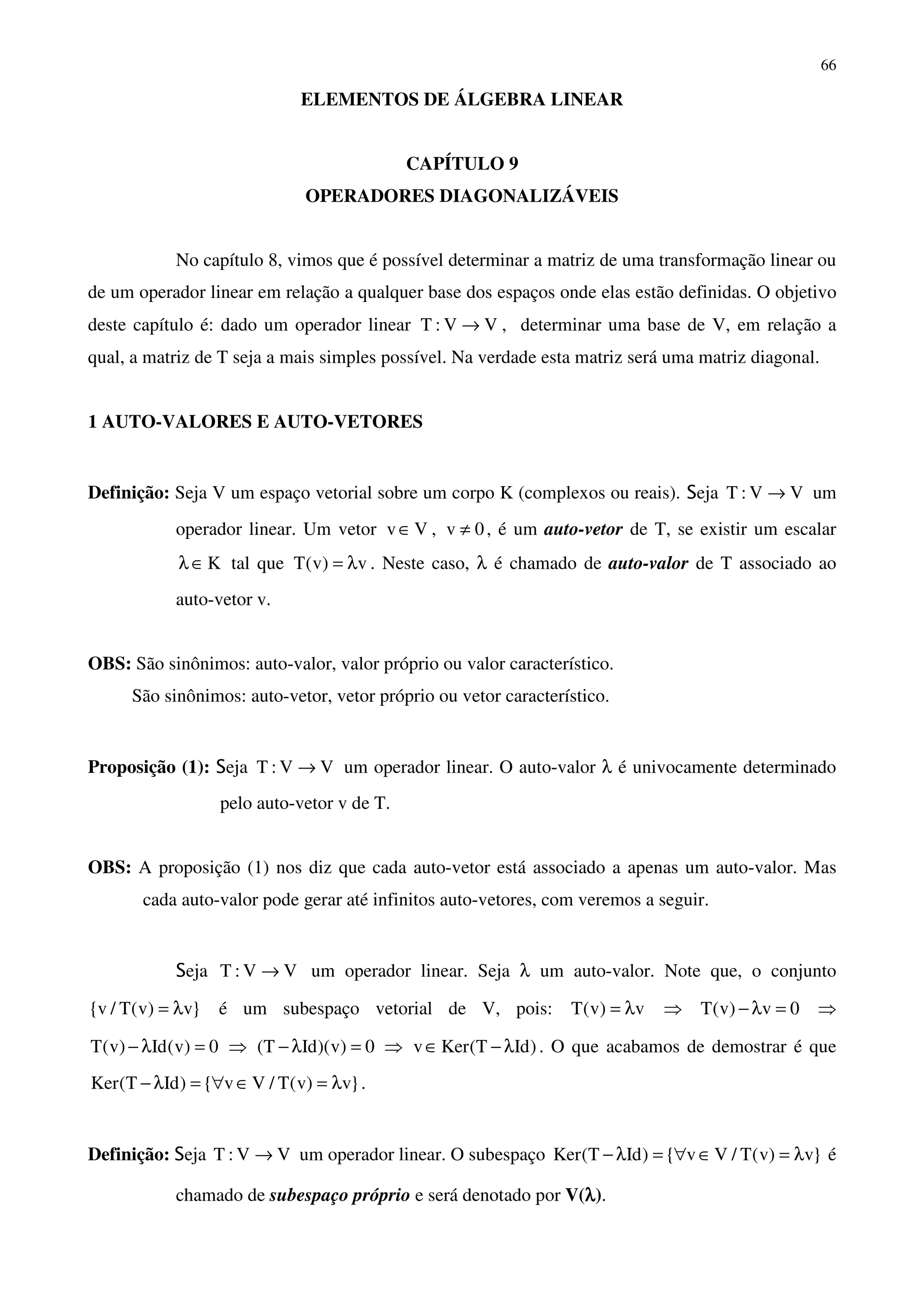 Este documento descreve operadores diagonalizáveis em álgebra linear. Os principais pontos são: