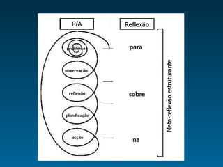 O documento discute a importância do educador reflexivo, que deve se distanciar de papéis burocráticos e se envolver em práticas que promovam um diálogo contínuo com a realidade. Destaca-se a necessidade de formação reflexiva através de perguntas, observação, análise de casos e pesquisa-ação, enfatizando que o desenvolvimento do educador é um processo contínuo de autoconhecimento e reflexão. Ser um educador reflexivo implica agir com consciência e responsabilidade na sociedade, sempre em busca de melhorar suas práticas educativas.