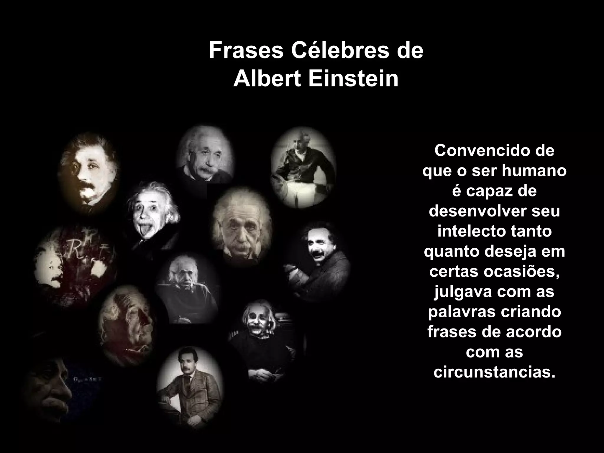 Este documento contém várias frases célebres de Albert Einstein ao longo de sua vida, desde a infância até a velhice, abordando tópicos como educação, ciência, religião, política e filosofia. As frases ilustram sua visão de mundo e pensamento revolucionário que o tornou um dos maiores cientistas de todos os tempos.