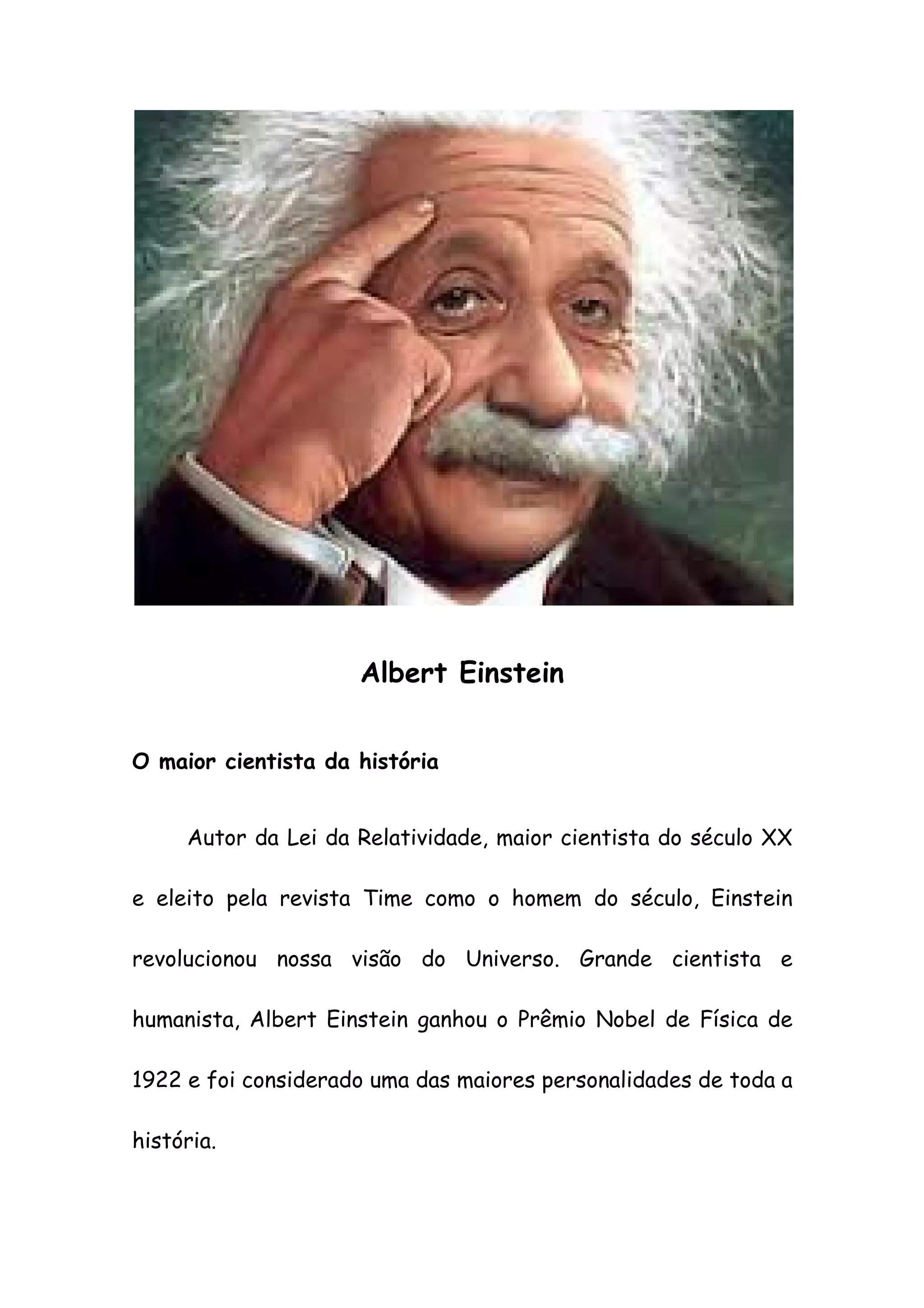 Albert Einstein foi o maior cientista do século XX, revolucionando nossa visão do universo com suas teorias da relatividade e equação E=mc2. Ele nasceu na Alemanha em 1879 e tornou-se professor na Alemanha e Suíça, recebendo o Prêmio Nobel de Física em 1922. Após fuga do nazismo, mudou-se para os EUA onde continuou pesquisando até sua morte em 1955.