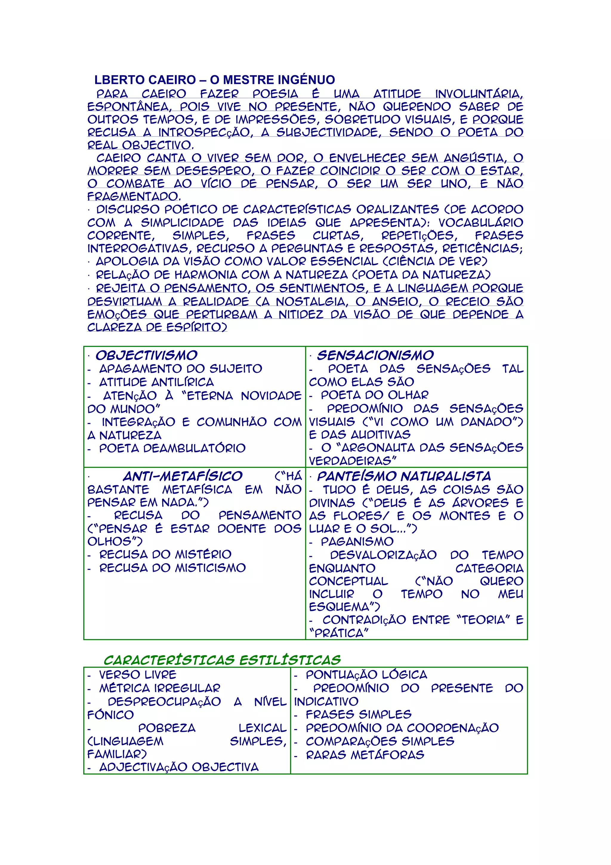 Caeiro é descrito como um poeta ingênuo que vive no presente e recusa a introspecção e subjetividade. Ele canta sobre viver sem dor ou angústia, envelhecer sem medo da morte, e ser um com a natureza em vez de fragmentado. Seu discurso poético é simples com linguagem corrente e frases curtas.