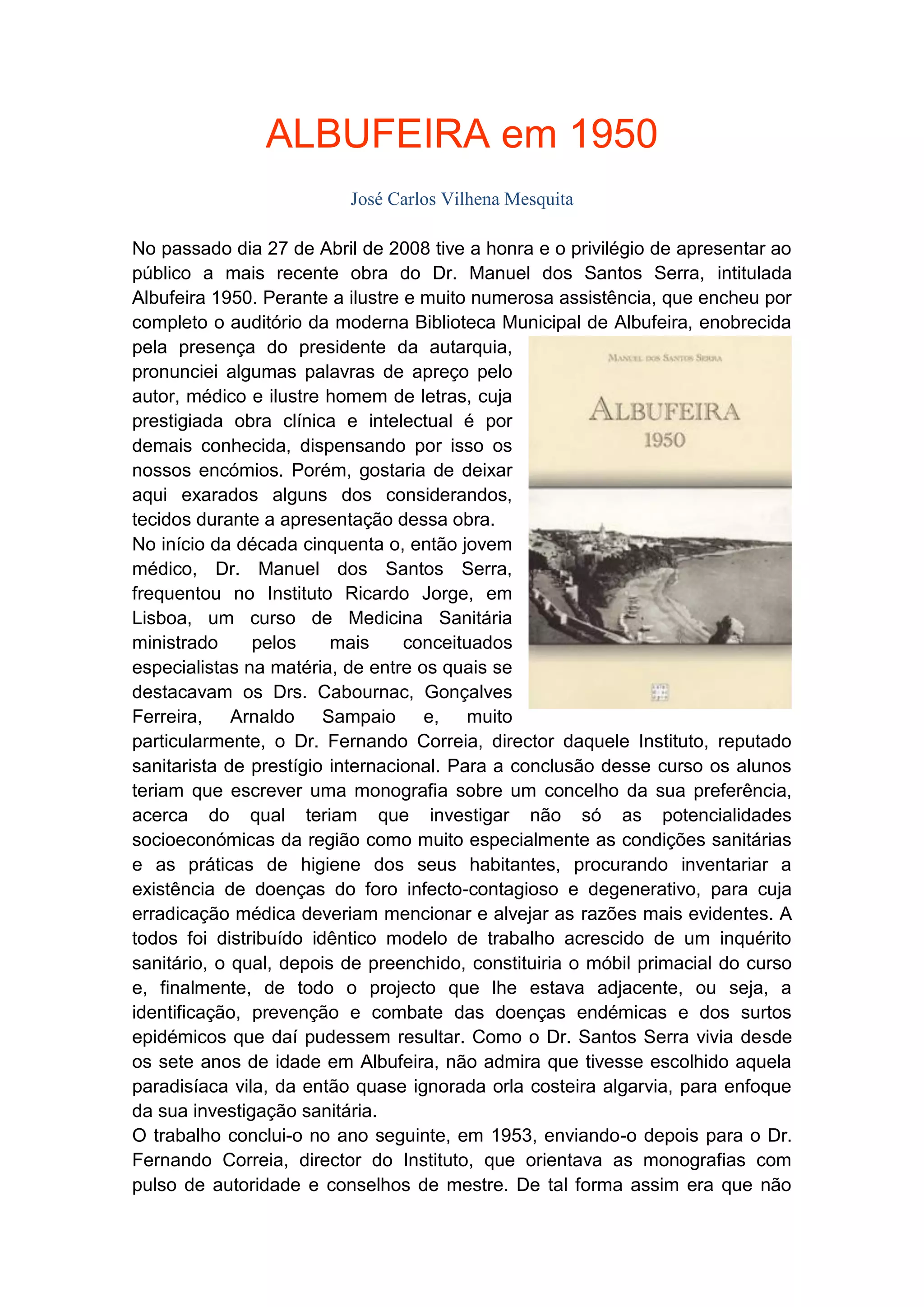 Este documento resume uma monografia escrita em 1950 pelo Dr. Manuel dos Santos Serra sobre o concelho de Albufeira. A monografia descreve detalhadamente as condições sociais, econômicas, demográficas e de saúde pública em Albufeira naquela época. O documento também compara esses dados com a situação atual, notando grandes diferenças devido ao crescimento do turismo.