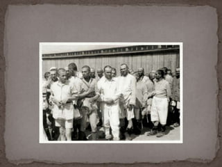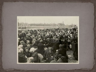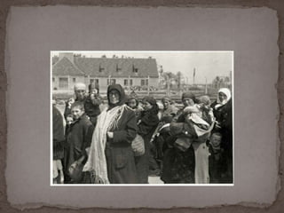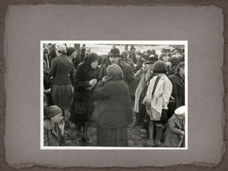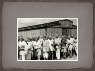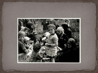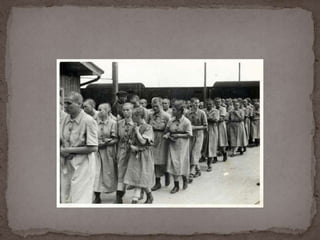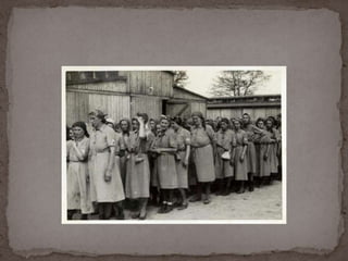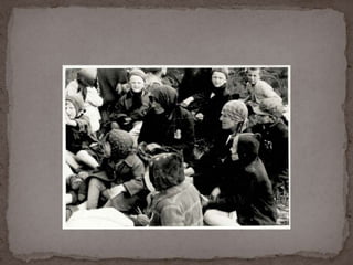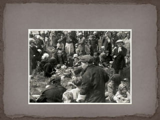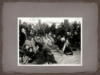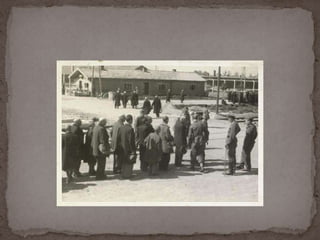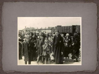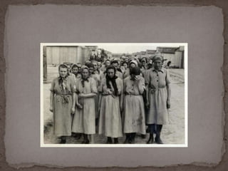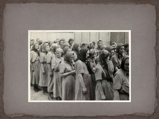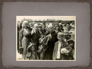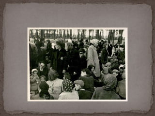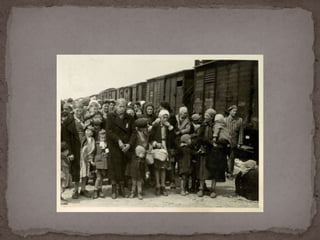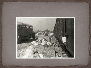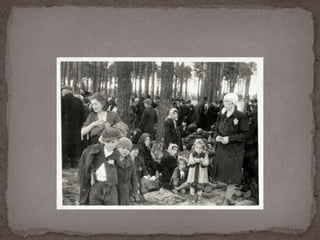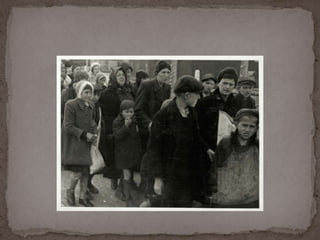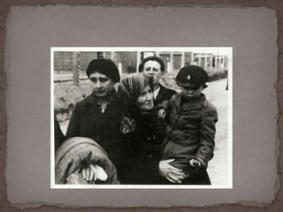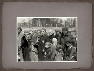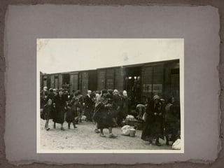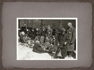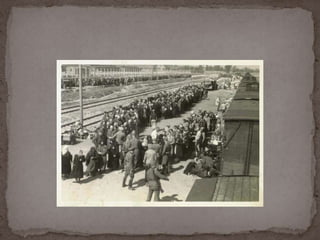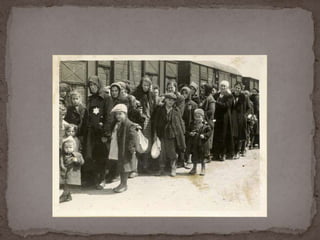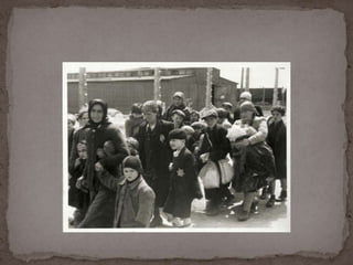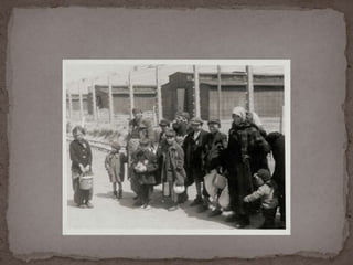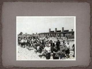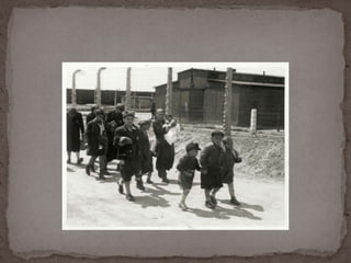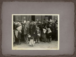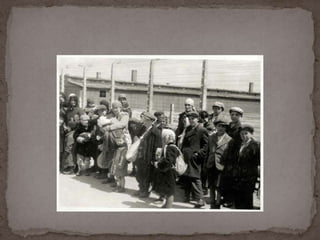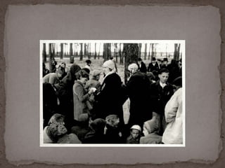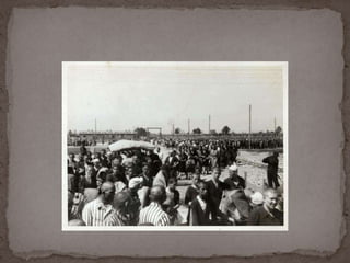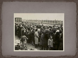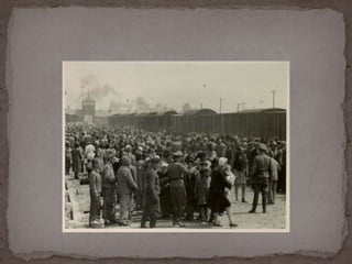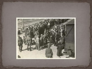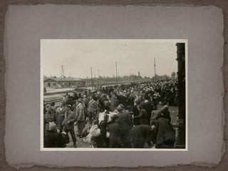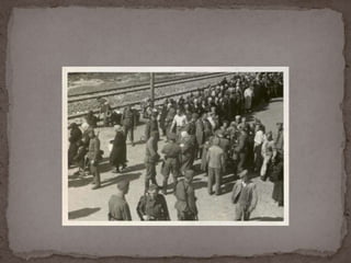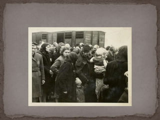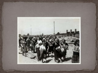 O documento descreve o álbum de fotografias de Auschwitz, documentando a chegada de judeus húngaros em 1944. As fotos mostram o processo de seleção para envio aos crematórios ou trabalho forçado, incluindo imagens de mulheres, crianças e idosos sendo enviados imediatamente para a câmara de gás. O álbum foi doado ao Yad Vashem e contém 193 fotografias capturando o horror do Holocausto.