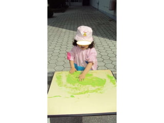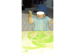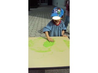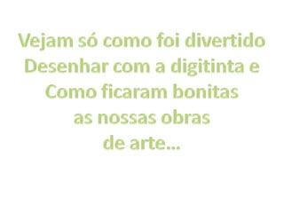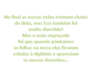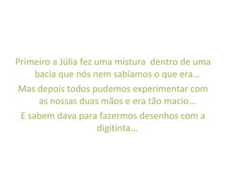 Primeiro a Júliafez uma mistura dentro de uma bacia que nós nem sabíamos o que era… Mas depois todos pudemos experimentar com as nossas duas mãos e era tão macio… E sabem dava para fazermos desenhos com a digitinta…