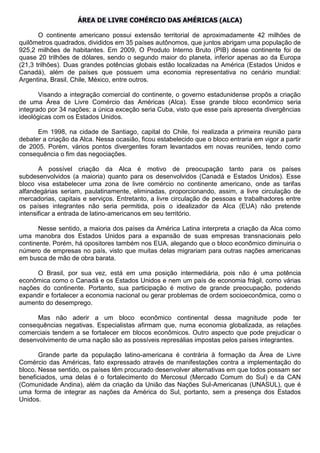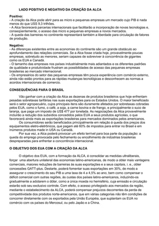 O documento discute a proposta de criação da Área de Livre Comércio das Américas (ALCA) entre os países das Américas. A ALCA visava eliminar gradualmente tarifas alfandegárias e permitir livre circulação de mercadorias, capitais e serviços, mas não de pessoas. Havia preocupações sobre como isso afetaria pequenas empresas e desemprego nos países em desenvolvimento, e se beneficiaria principalmente os interesses econômicos dos EUA. Muitos latino-americanos eram contrários à proposta.