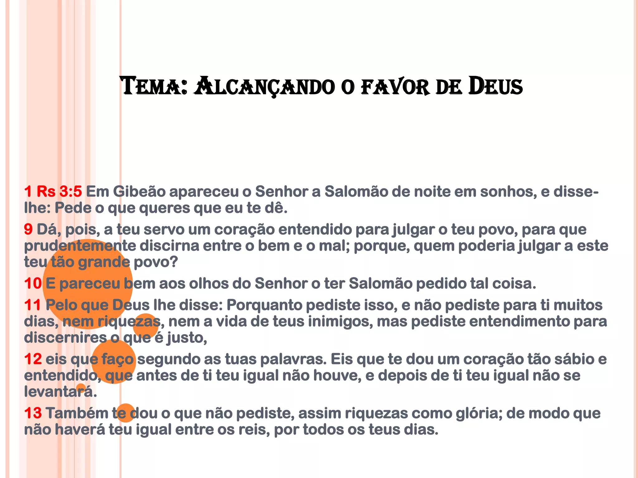 Este documento resume um texto bíblico sobre Salomão pedindo sabedoria a Deus. [1] Salomão teve um sonho onde Deus lhe disse para pedir o que quisesse. [2] Salomão pediu sabedoria para julgar o povo de forma justa. [3] Deus ficou satisfeito com o pedido de Salomão e o concedeu sabedoria além do que ele pediu, junto com riquezas e glória.