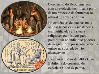 O consumo de álcool tem uma longa história, sendo usado em rituais religiosos por tribos antigas e cultivado pelos egípcios, gregos e romanos. Ao longo dos séculos, sua produção e uso se desenvolveram, mas também surgiram problemas relacionados ao seu abuso, como o alcoolismo. Atualmente, o álcool causa danos significativos à saúde quando consumido em excesso.