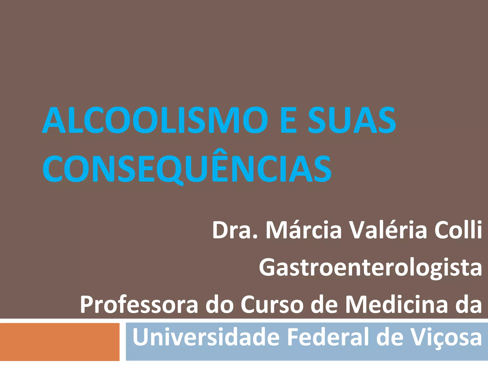 O documento discute o alcoolismo e suas consequências. Aborda a prevalência de dependentes de álcool, o histórico do álcool, conceitos como alcoolismo e dependência, sintomas e diagnóstico do alcoolismo, efeitos no comportamento, e tratamento incluindo Alcoólicos Anônimos.