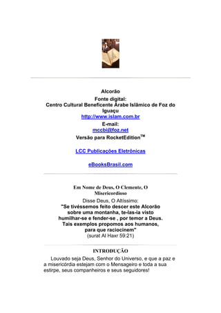 O documento discorre sobre o Alcorão, ressaltando sua importância como a palavra de Deus revelada ao profeta Muhammad, abordando temas como a crença, jurisprudência e ensinamentos morais. Ele explica o processo de revelação, registro e preservação do texto sagrado, enfatizando a necessidade de meditação e entendimento dos versículos. O Alcorão é apresentado como uma luz orientadora que transforma a vida das pessoas, oferecendo soluções e diretrizes para questões intelectuais e espirituais.