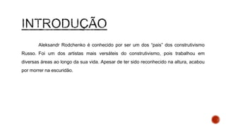 Aleksandr Rodchenko foi um artista russo multifacetado e um dos fundadores do construtivismo russo. Trabalhou como fotógrafo, pintor e designer gráfico, criando obras abstratas e cartazes revolucionários. Apesar de reconhecido inicialmente, acabou morrendo em obscuridade devido a problemas com o governo soviético.