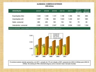 A Alemanha é um país desenvolvido localizado na Europa central, com clima temperado e relevo variado que inclui planícies e montanhas. Sua população de 81 milhões é altamente urbanizada e alfabetizada, com taxa de natalidade baixa. A economia alemã é a quarta maior do mundo e baseia-se em indústrias de alta tecnologia.