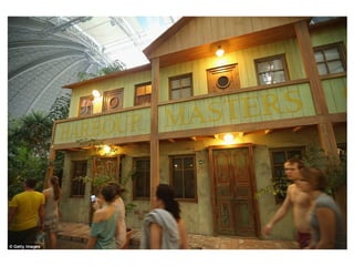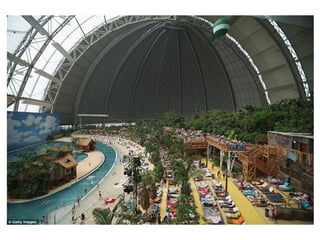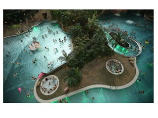 O documento descreve o maior parque aquático interior do mundo, o Resort Tropical Islands na Alemanha. Originalmente construído como um hangar para Zeppelins, o local foi transformado em um resort tropical completo com floresta, praia, sol artificial e sons da natureza.