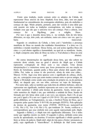 O Aleph é a letra hebraica que representa Deus na Cabala. Simboliza o começo do universo e é formada por dois yods e um vav, que representam Deus no céu e na terra e o mundo manifesto entre eles. O valor numérico do Aleph corresponde ao nome inefável de Deus.