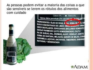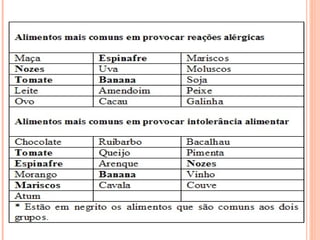 O documento discute alergia alimentar, incluindo suas causas, sintomas, tratamentos e prevalência. Fatores genéticos, contato com alérgenos e ambientais podem levar ao desenvolvimento da alergia. Os sintomas variam de dor abdominal a anafilaxia e o tratamento envolve dieta de eliminação e medicação. Alergias alimentares afetam cerca de 6-8% das crianças com menos de 3 anos.
