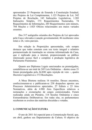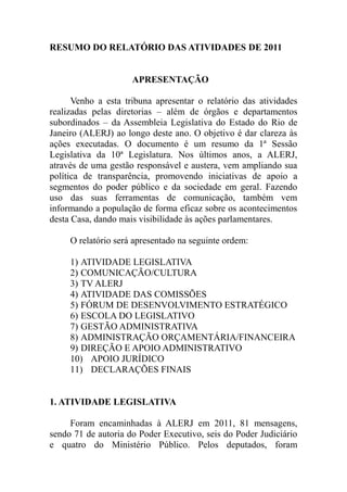 O relatório resume as atividades da Assembleia Legislativa do Estado do Rio de Janeiro em 2011, incluindo a atividade legislativa, as ações da comunicação e cultura, e os programas da TV ALERJ. As comissões realizaram audiências públicas e reuniões, enquanto a gestão administrativa e a Escola do Legislativo qualificaram funcionários e promoveram cursos.