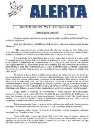 O documento discute a importância de centros espíritas utilizarem as mídias sociais, como o Facebook, para divulgar a doutrina espírita e atrair novos membros. Ele relata a experiência de um centro espírita em Macatuba que atraiu muitas pessoas novas após divulgações constantes no Facebook. Também argumenta que Allan Kardec aprovaria o uso dessas ferramentas modernas para espalhar os ensinamentos espíritas.