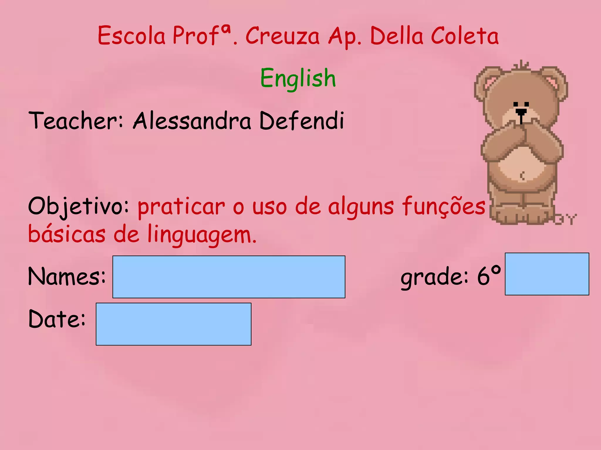 O documento apresenta um conjunto de exercícios em inglês para alunos da 6a série praticarem funções básicas da linguagem como cumprimentar, se apresentar, falar sobre si e completar quadros com informações pessoais.