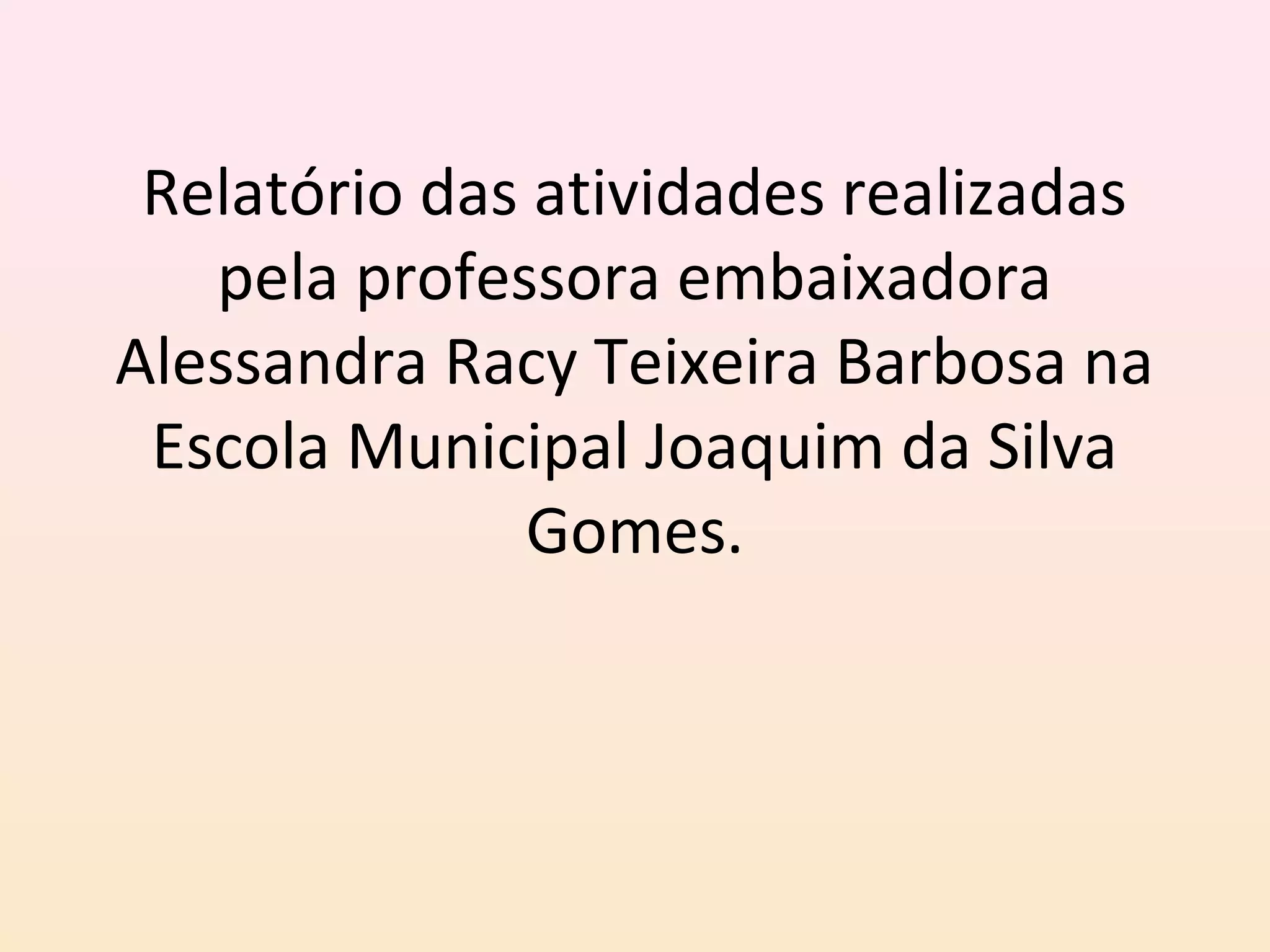 O relatório descreve como a professora Alessandra Racy Teixeira Barbosa trabalhou com alunos da Escola Municipal Joaquim da Silva Gomes para construir um mural sobre a Educopédia, no qual os alunos participaram desenhando e expressando suas opiniões sobre experiências com a Educopédia.