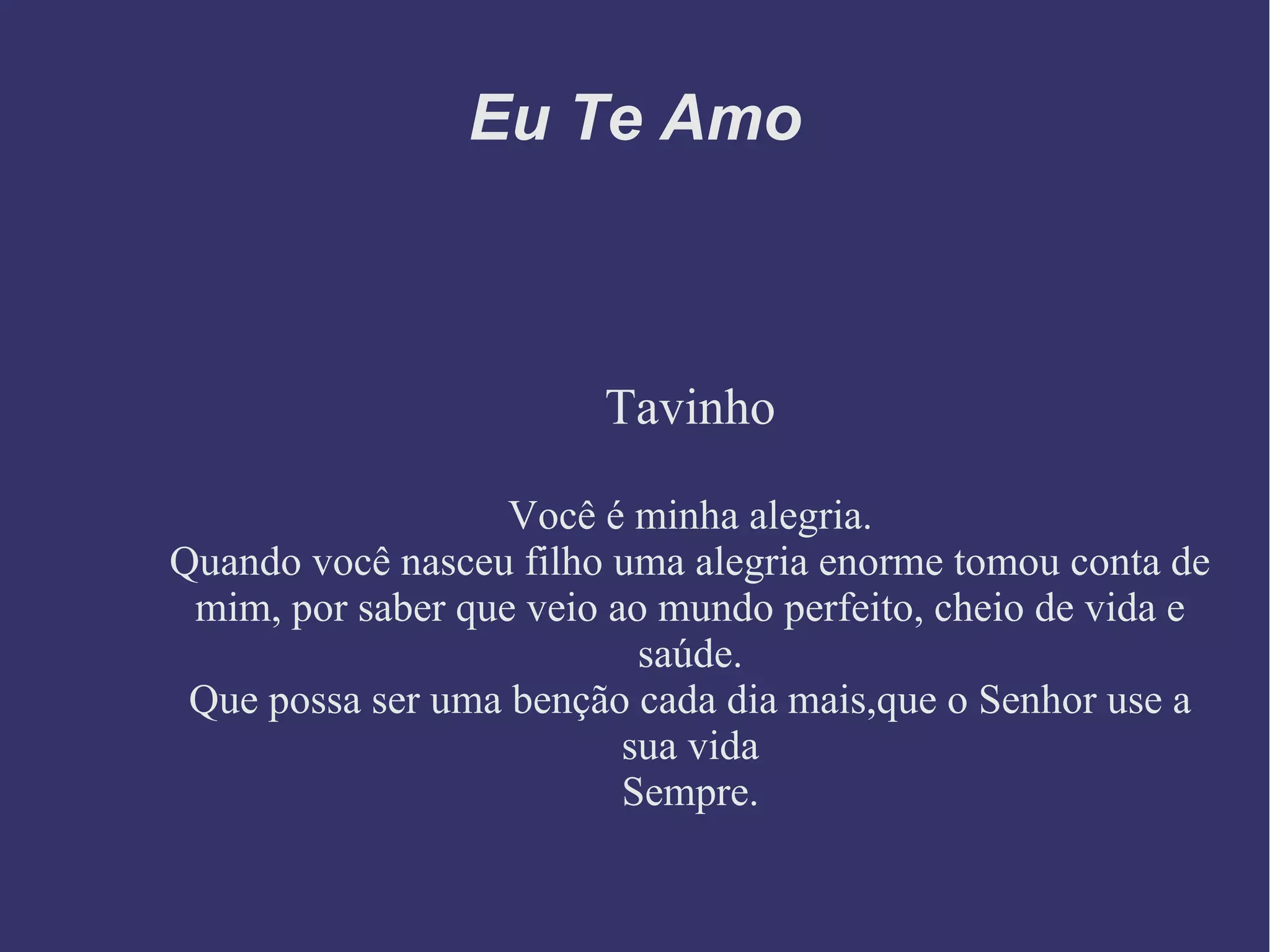 Uma carta de amor de um pai para o filho expressando a alegria que sente por seu nascimento e saúde, e desejando que a vida do filho seja uma benção cada dia mais com o Senhor usando sua vida.