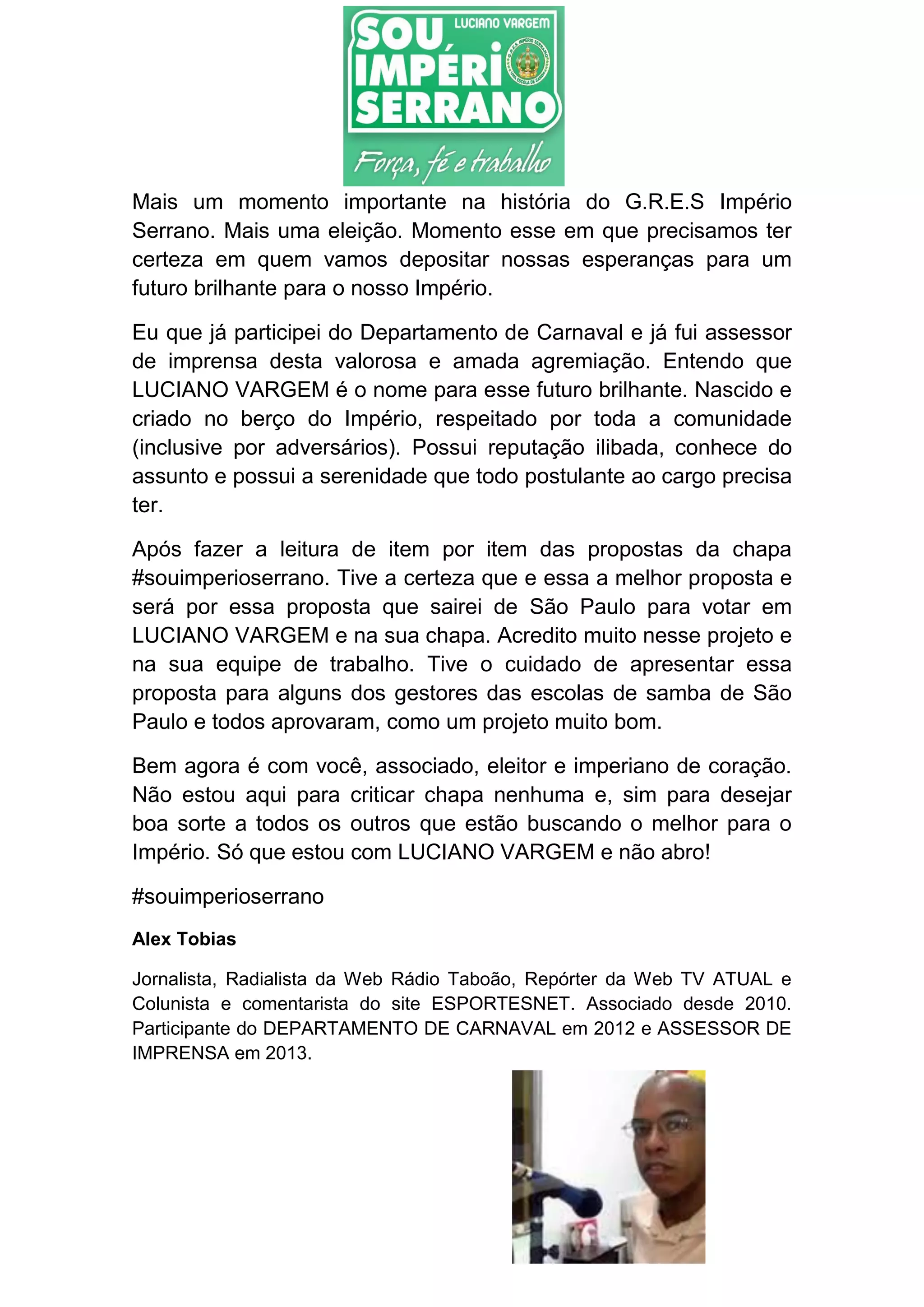 Uma eleição está ocorrendo no G.R.E.S Império Serrano para escolher novos líderes. O autor apoia Luciano Vargem e sua chapa #souimperioserrano, acreditando que ele é a melhor opção por seu caráter e experiência no Império Serrano, além de ter boas propostas. A chapa recebeu aprovação de outros líderes de escolas de samba de São Paulo. O autor pede que os associados votem em Luciano Vargem.
