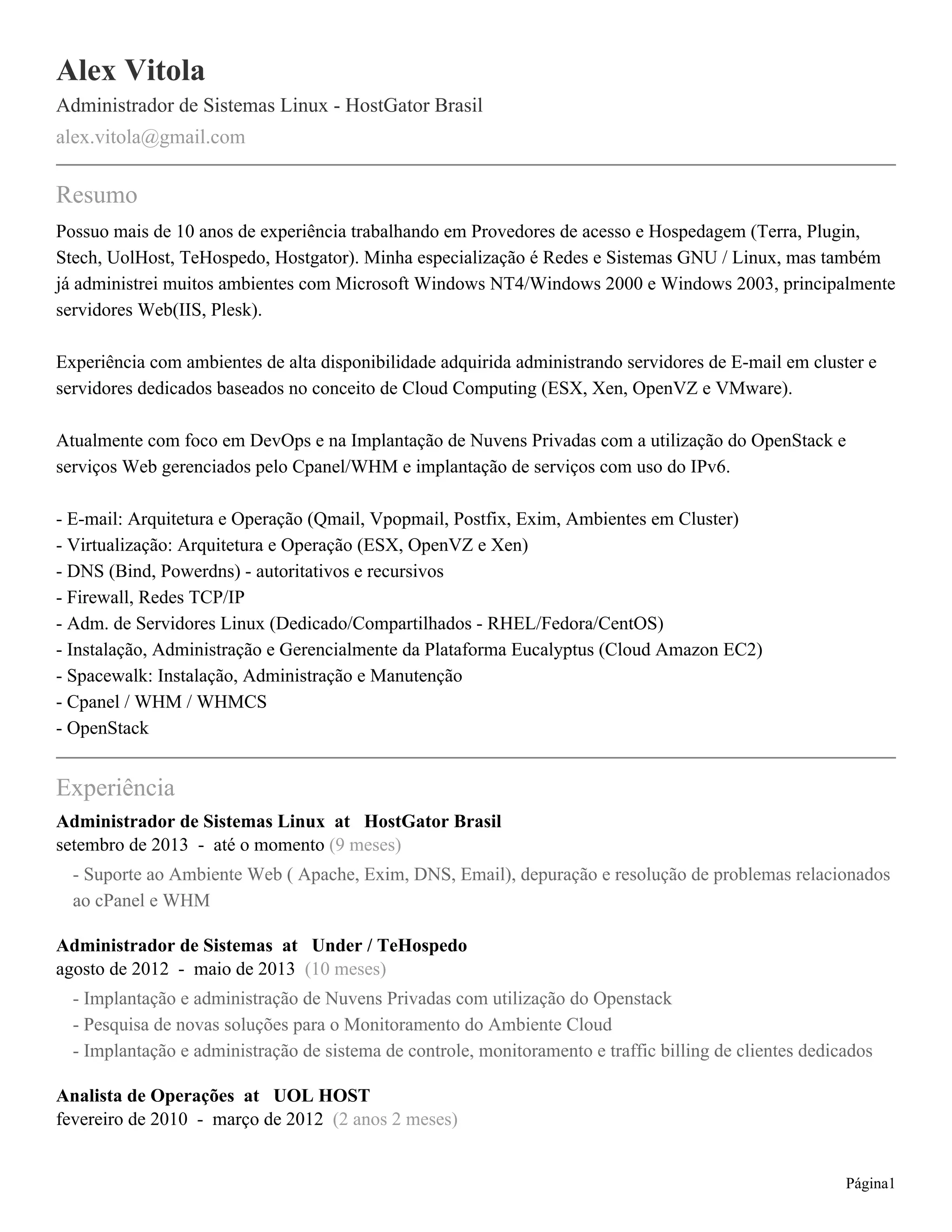 Alex Vitola tem mais de 10 anos de experiência em administração de sistemas Linux. Atualmente trabalha na HostGator Brasil com foco em DevOps e nuvens privadas usando OpenStack. Ele possui vasto conhecimento em virtualização, email, DNS, firewalls e redes.