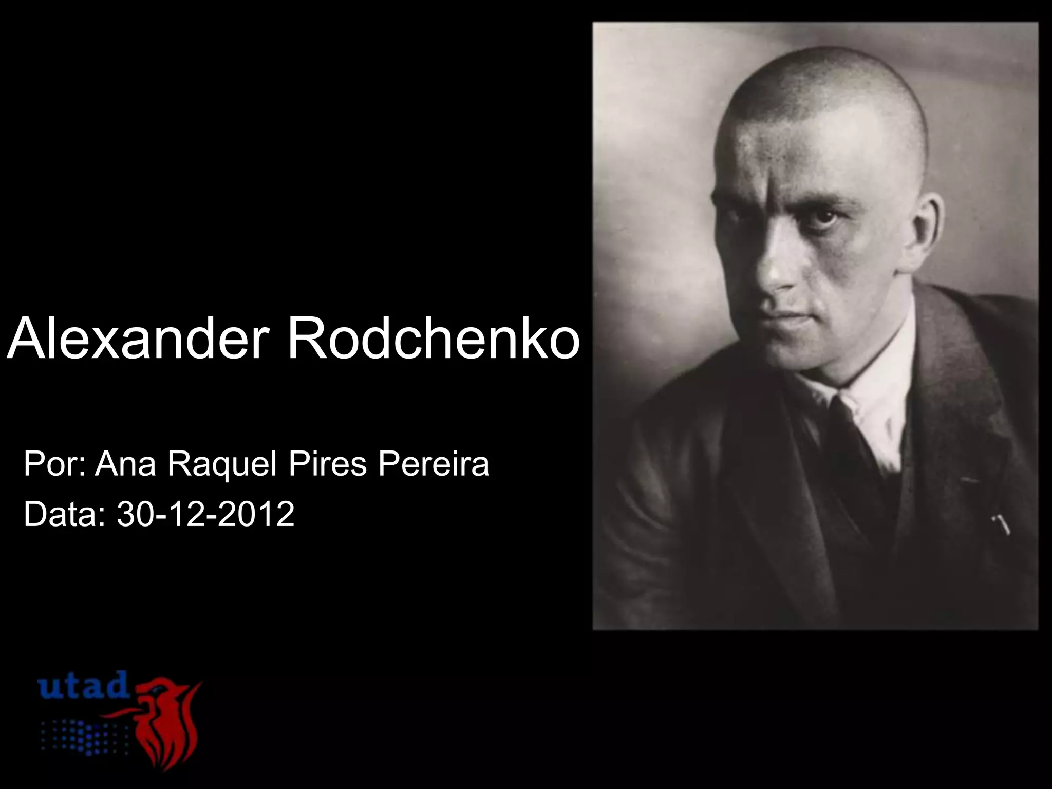 Este documento descreve o artista construtivista russo Alexander Rodchenko, incluindo sua biografia, obras e influência no movimento construtivista russo. O documento fornece detalhes sobre a vida e carreira de Rodchenko, desde seu nascimento em 1891 até sua morte em 1956, durante o qual ele experimentou várias técnicas artísticas como pintura, fotomontagem e fotografia. O documento também resume as características principais do construtivismo russo, como o uso de elementos geométricos, cores primárias