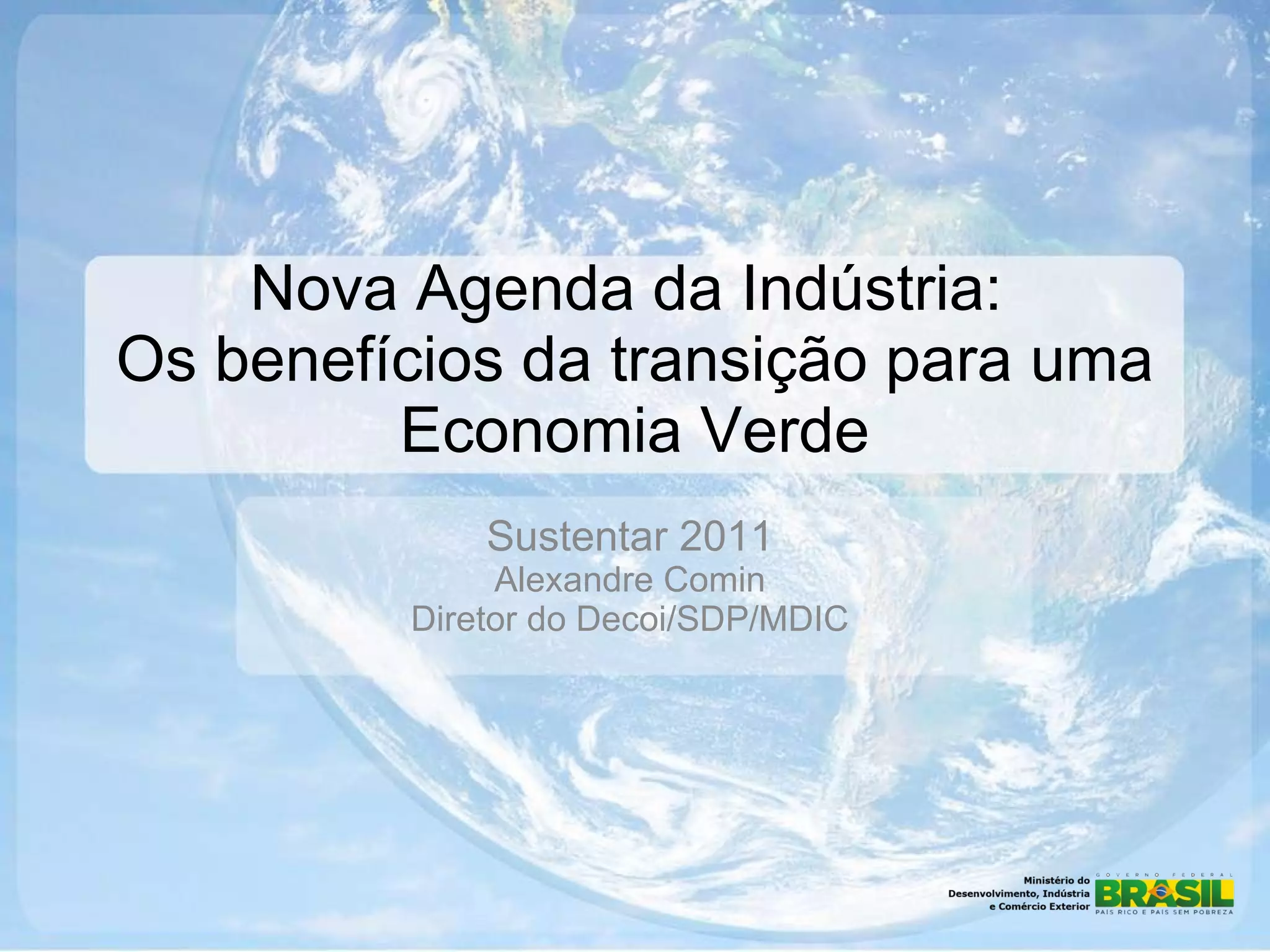 O documento discute os benefícios da transição para uma economia verde sustentável no Brasil, incluindo a redução de impactos ambientais, aumento da competitividade e atração de investimentos. Aborda também as oportunidades das energias renováveis, eficiência energética, indústria verde e gestão de resíduos.