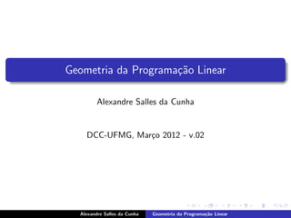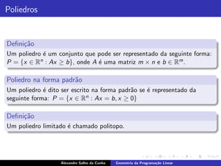 O documento descreve conceitos básicos de geometria da programação linear, incluindo definições de poliedros, semiespaços, hiperplanos e suas relações. Também apresenta definições equivalentes de pontos extremos, vértices e soluções básicas de um poliedro.