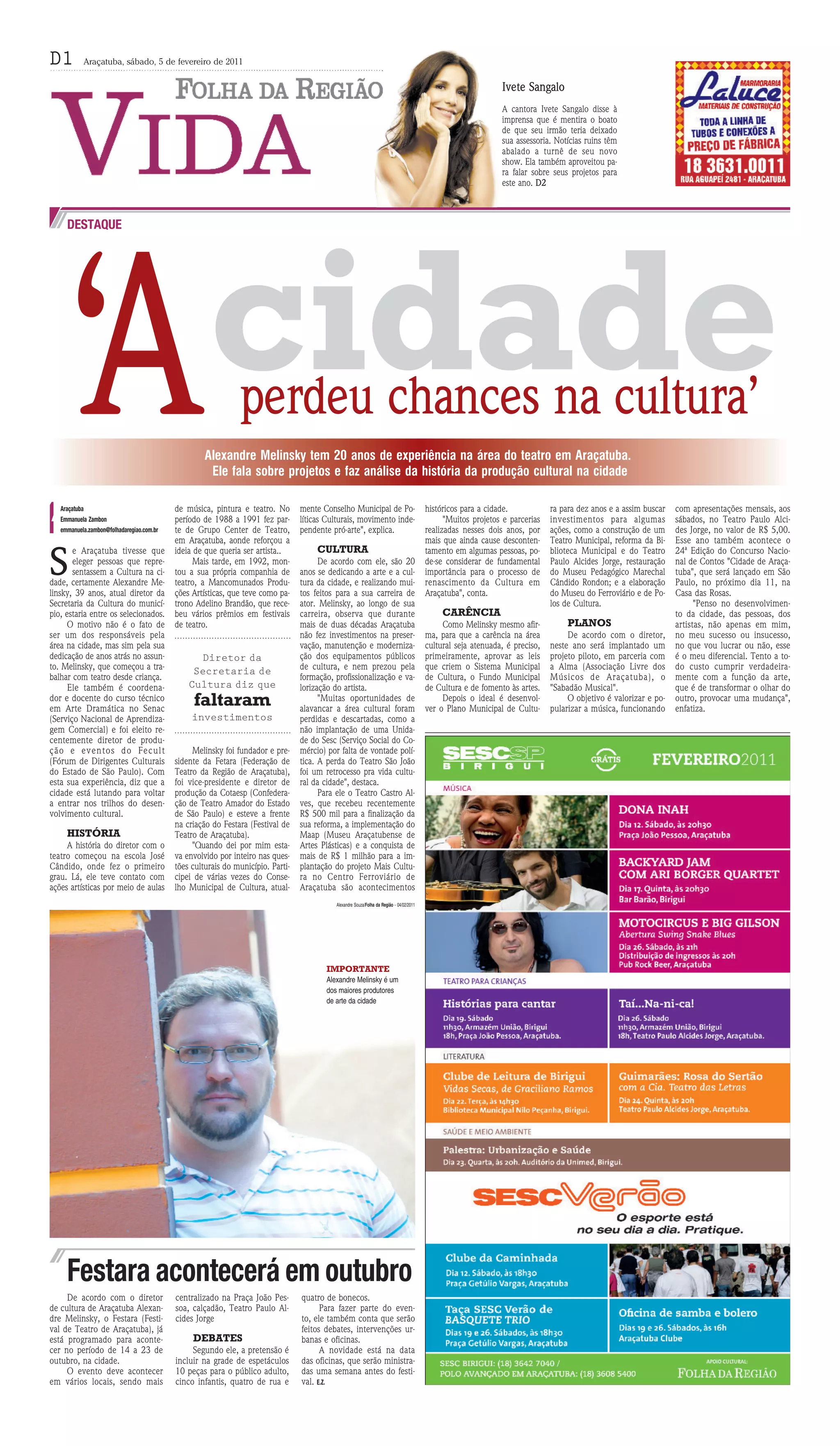 2) Alexandre Melinsky, diretor da Secretaria da Cultura de Araçatuba, diz que a cidade perdeu oportunidades de investir na área cultural ao longo de 20 anos e que é preciso desenvolver políticas públicas para a cultura.