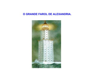 O documento descreve a história do Grande Farol de Alexandria, construído em 290 a.C. sob o comando de Ptolomeu I. O engenheiro Sóstrates projetou o farol, que se tornou um símbolo importante da cidade e guiava os navios com sua luz visível a grande distância. O farol foi destruído entre os séculos XII e XIV, possivelmente por atividades sísmicas, mas serviu de inspiração para outros faróis construídos na Europa.