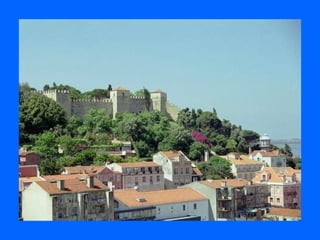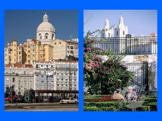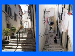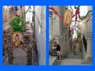 O documento descreve uma música fado chamada "Vielas de Alfama" pela cantora Mariza e inclui fotografias do bairro Alfama em Lisboa, Portugal.