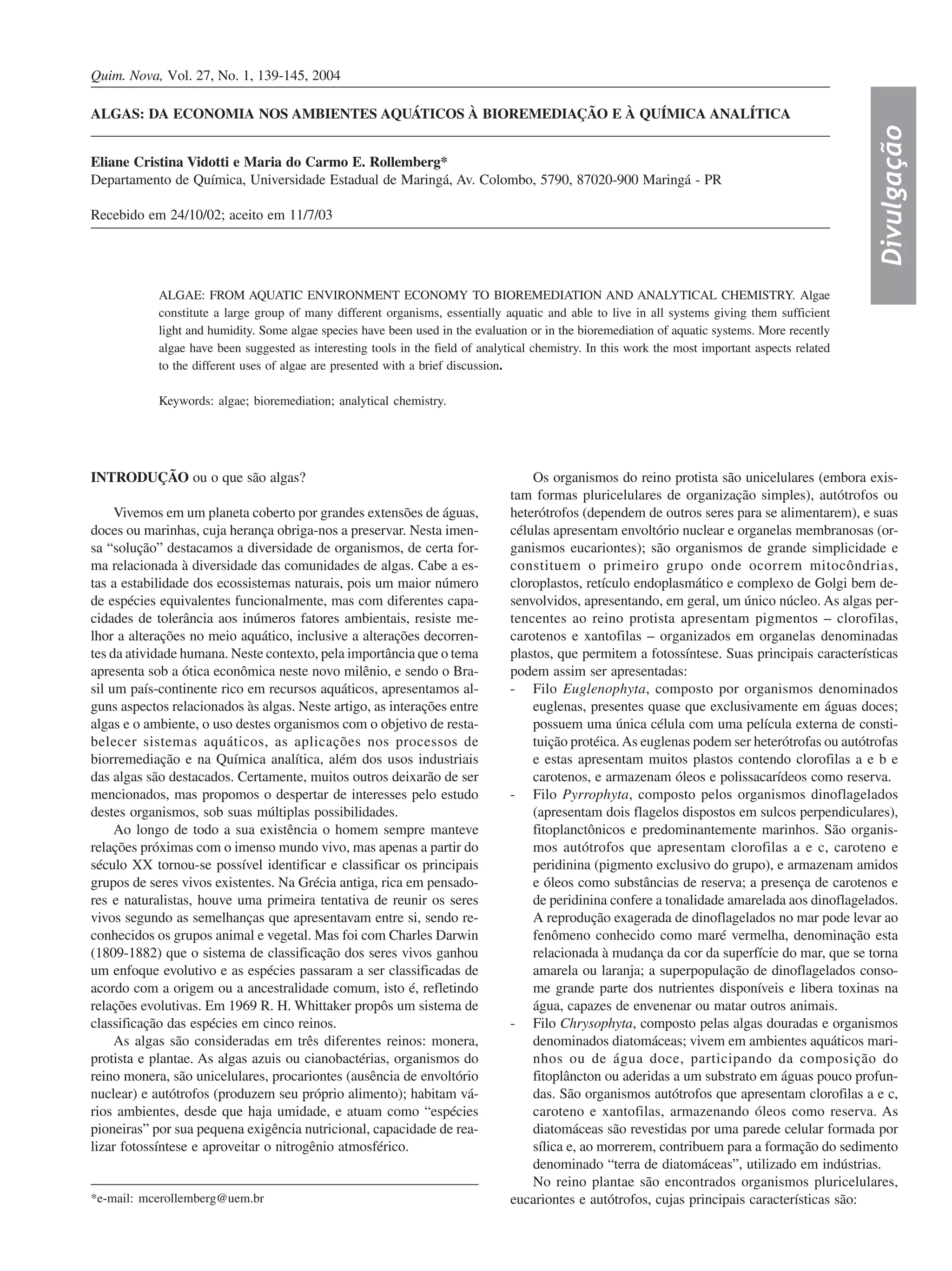 1) O documento discute o papel das algas nos ambientes aquáticos, seu uso em biorremediação e química analítica, e fornece um breve resumo de suas características principais.