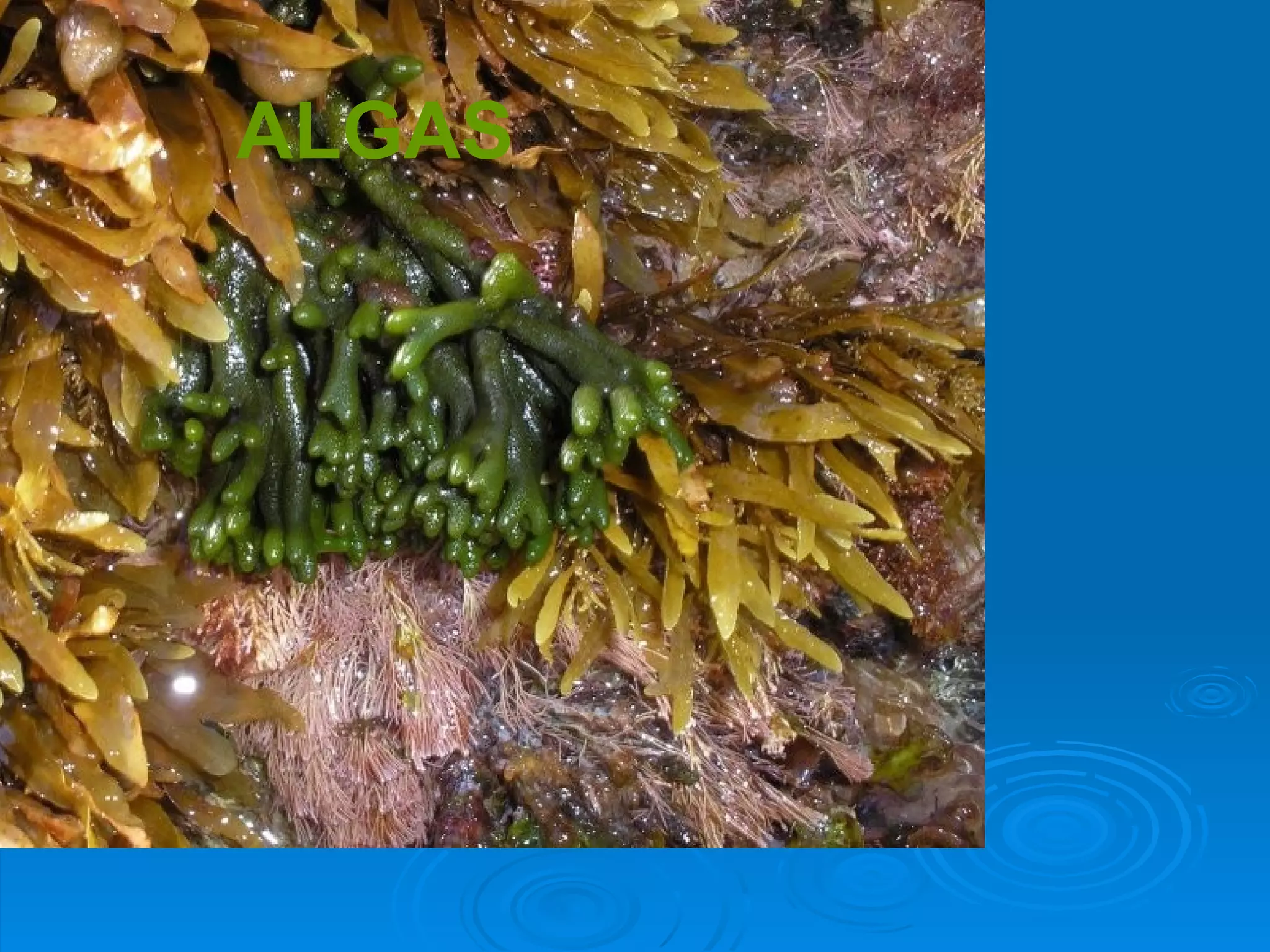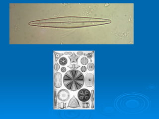 O documento descreve as principais características das algas, incluindo sua classificação no Reino Protista, organização em grupos como euglenófitas, pirrófitas, diatomáceas, clorófitas, feófitas e rodófitas, além de detalhar aspectos como reprodução, pigmentos, reservas e importância econômica.