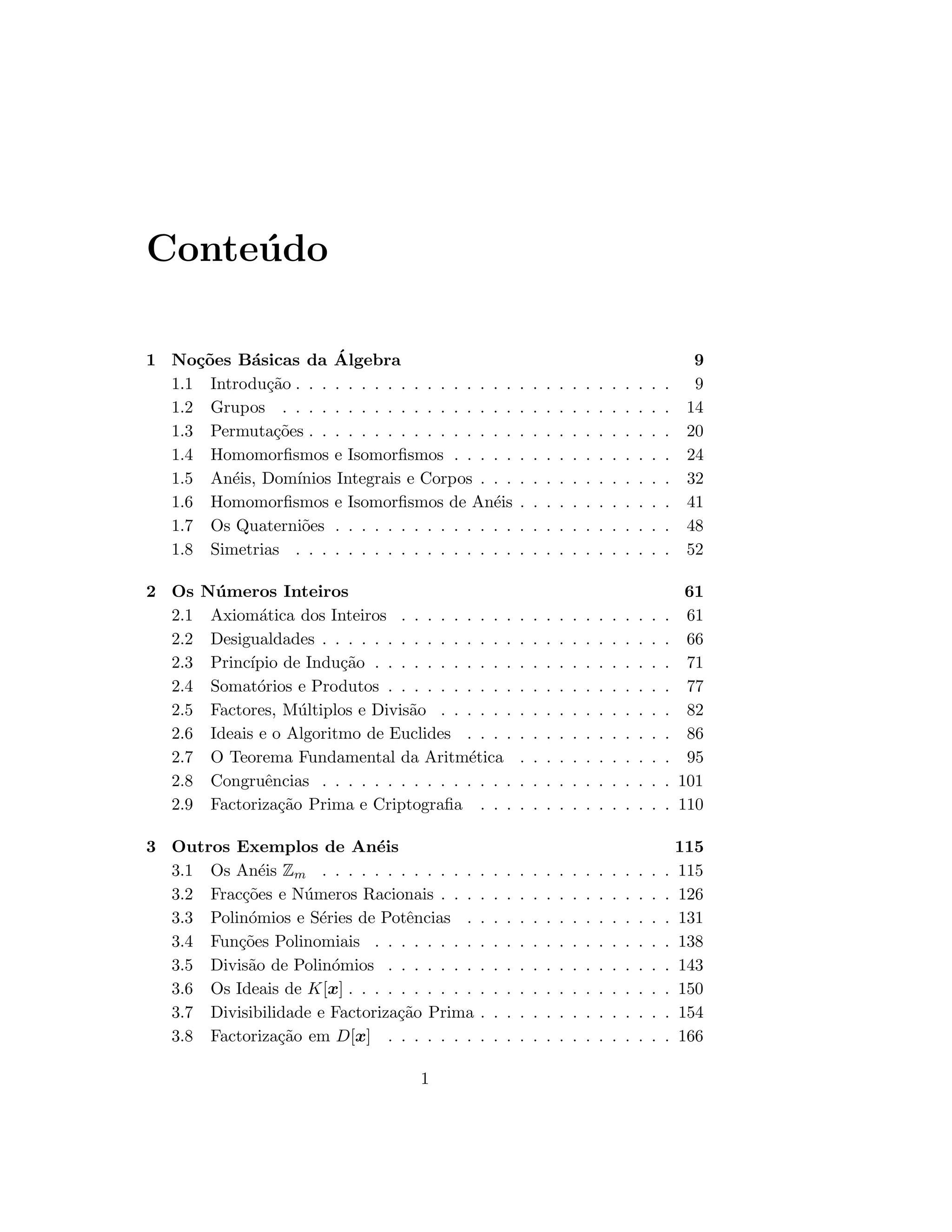 • Semestre 1: no¸c˜oes elementares (Cap´ıtulo 1), inteiros (Cap´ıtulo 2),