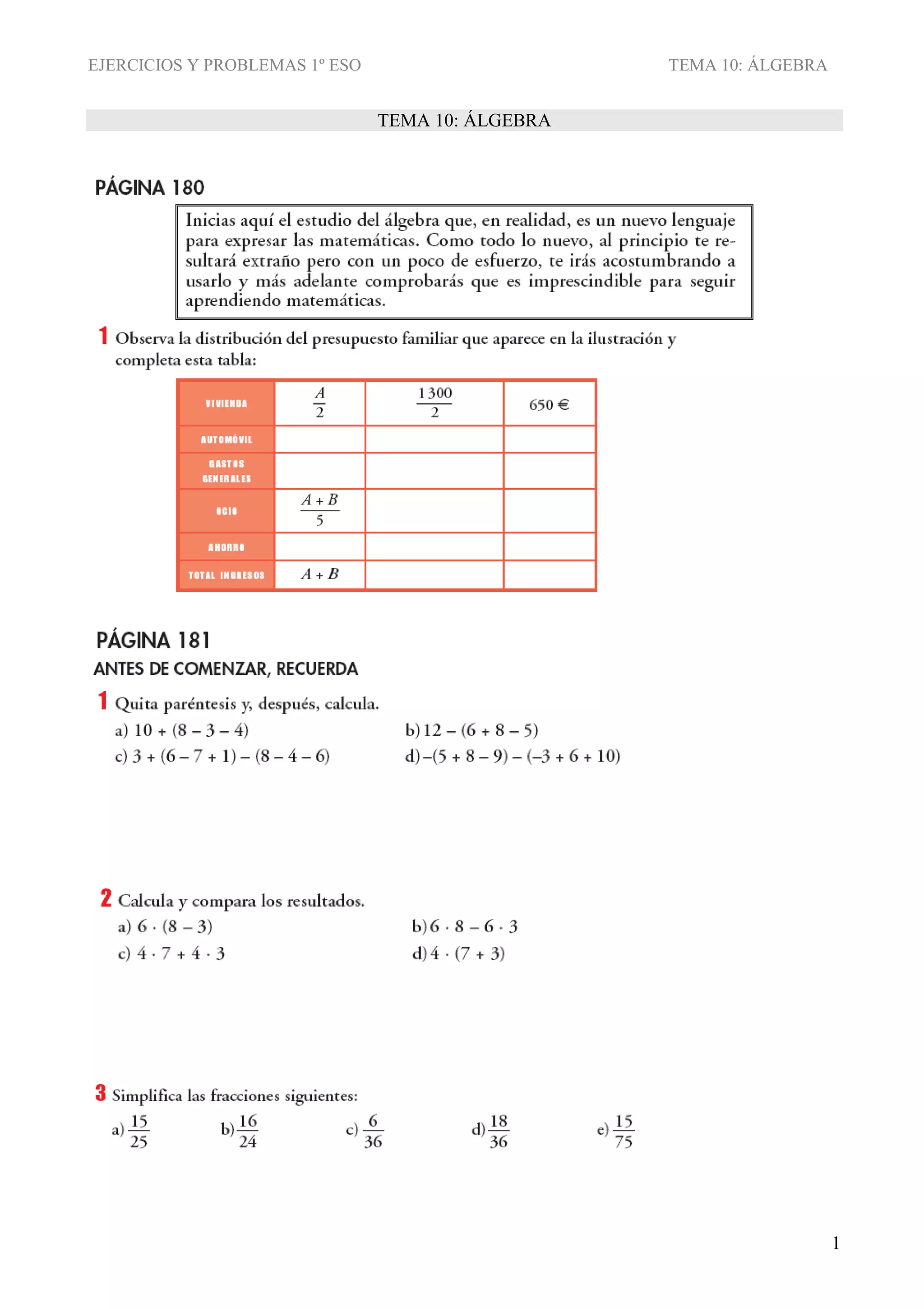 Este documento contém exercícios e problemas sobre álgebra para o 1o ano do ensino secundário. O documento está dividido em 23 páginas e aborda o Tema 10: Álgebra.