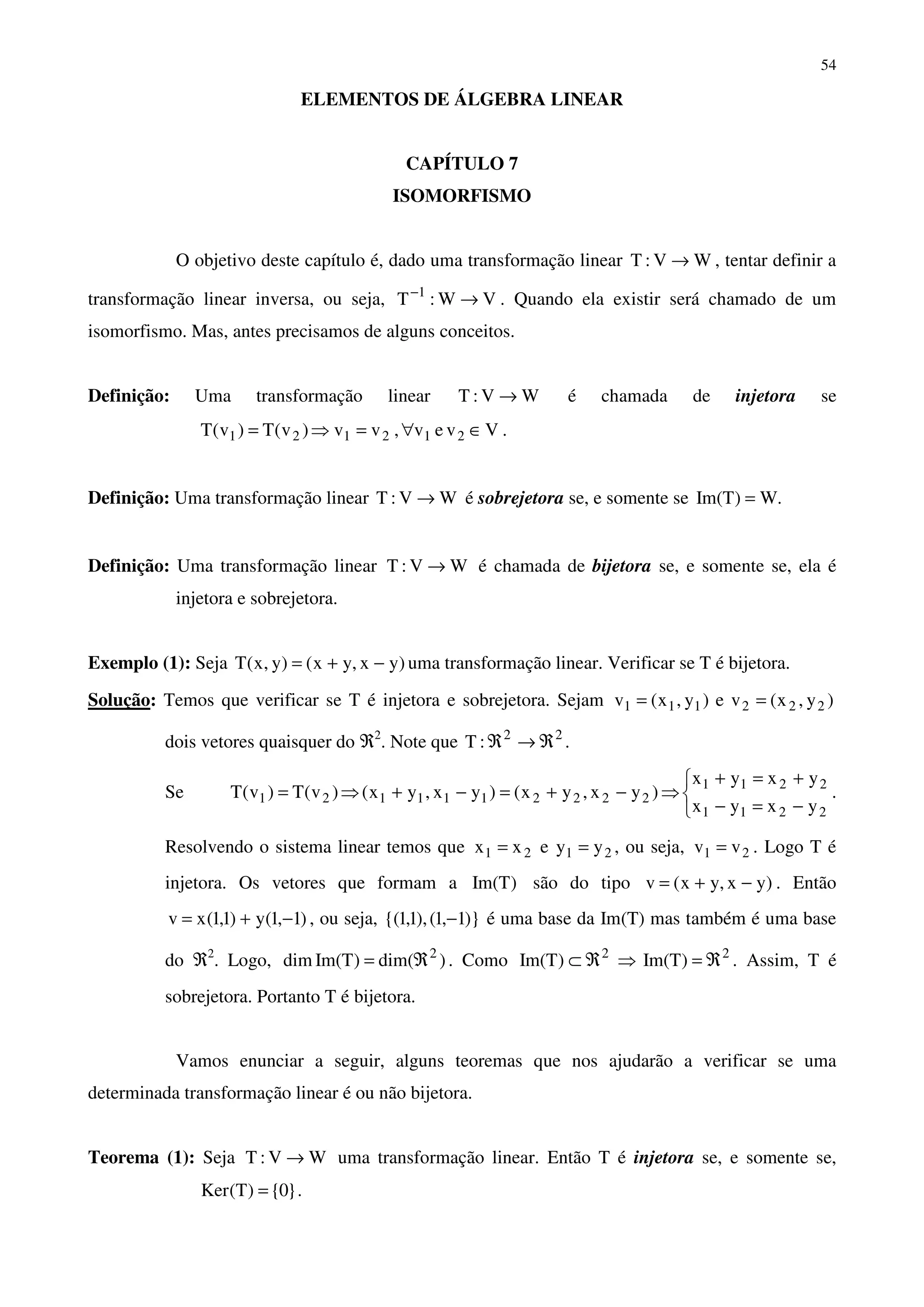 Este documento apresenta definições e teoremas sobre isomorfismo de espaços vetoriais. [1] Define transformação linear bijetora como isomorfismo e apresenta propriedades como a existência de inversa e isomorfismo entre espaços da mesma dimensão. [2] Aplica os conceitos em exemplos de verificação de isomorfismo e determinação da transformação inversa.