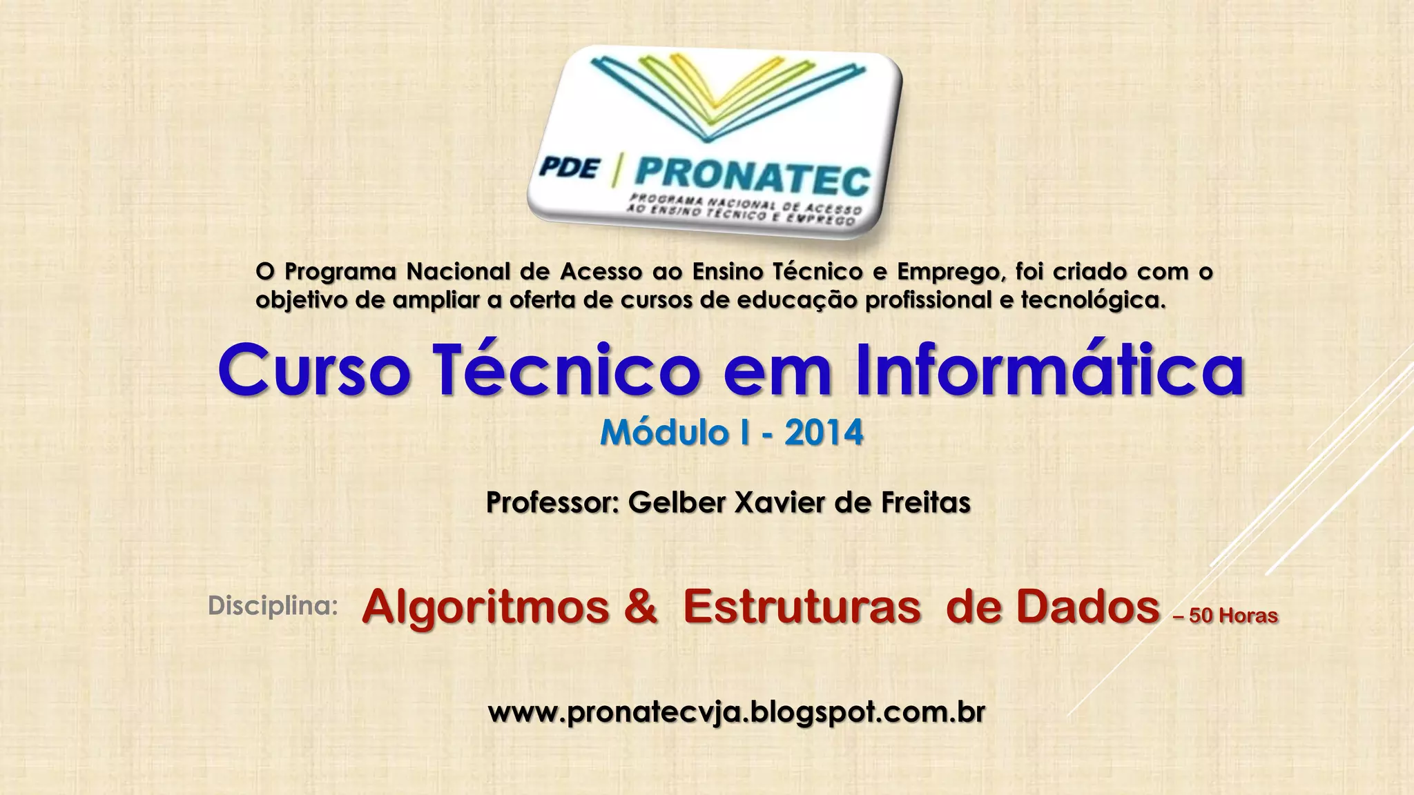 Este documento apresenta um módulo sobre algoritmos e estruturas de dados para um curso técnico em informática. O módulo inclui tópicos como história dos computadores, lógica de programação, algoritmos, estruturas de dados básicas como vetores e matrizes, e desenvolvimento de programação em linguagem de alto nível.
