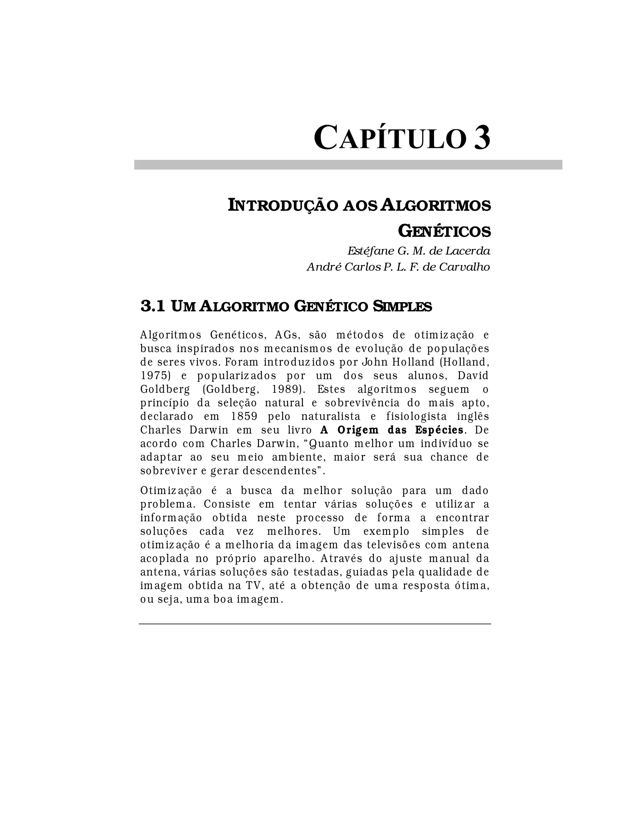 O documento introduz algoritmos genéticos, descrevendo um algoritmo genético simples em 3 etapas: 1) geração de uma população inicial aleatória, 2) seleção dos cromossomos mais aptos para gerar descendentes, 3) aplicação de operadores genéticos como crossover e mutação para gerar novas soluções. O algoritmo é aplicado para encontrar o máximo global de uma função com múltiplos máximos locais.