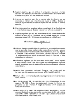 A lista de exercícios propõe 20 problemas de lógica de programação utilizando o Visual G para desenvolver algoritmos. Os exercícios envolvem ler valores de entrada e processá-los para calcular ou classificar dados, comparar resultados e exibir mensagens de saída.