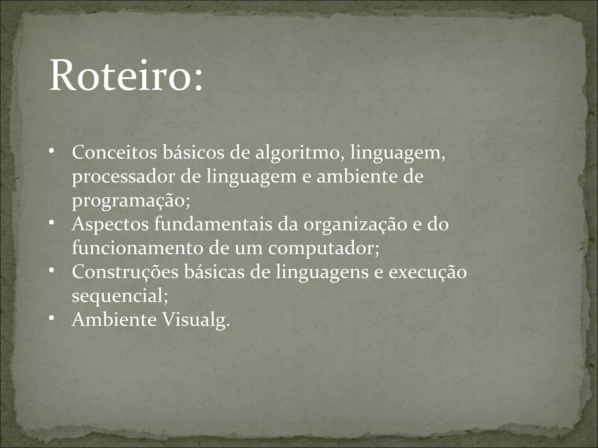 - Definição de algoritmos, variáveis, tipos de dados, expressões e comandos;