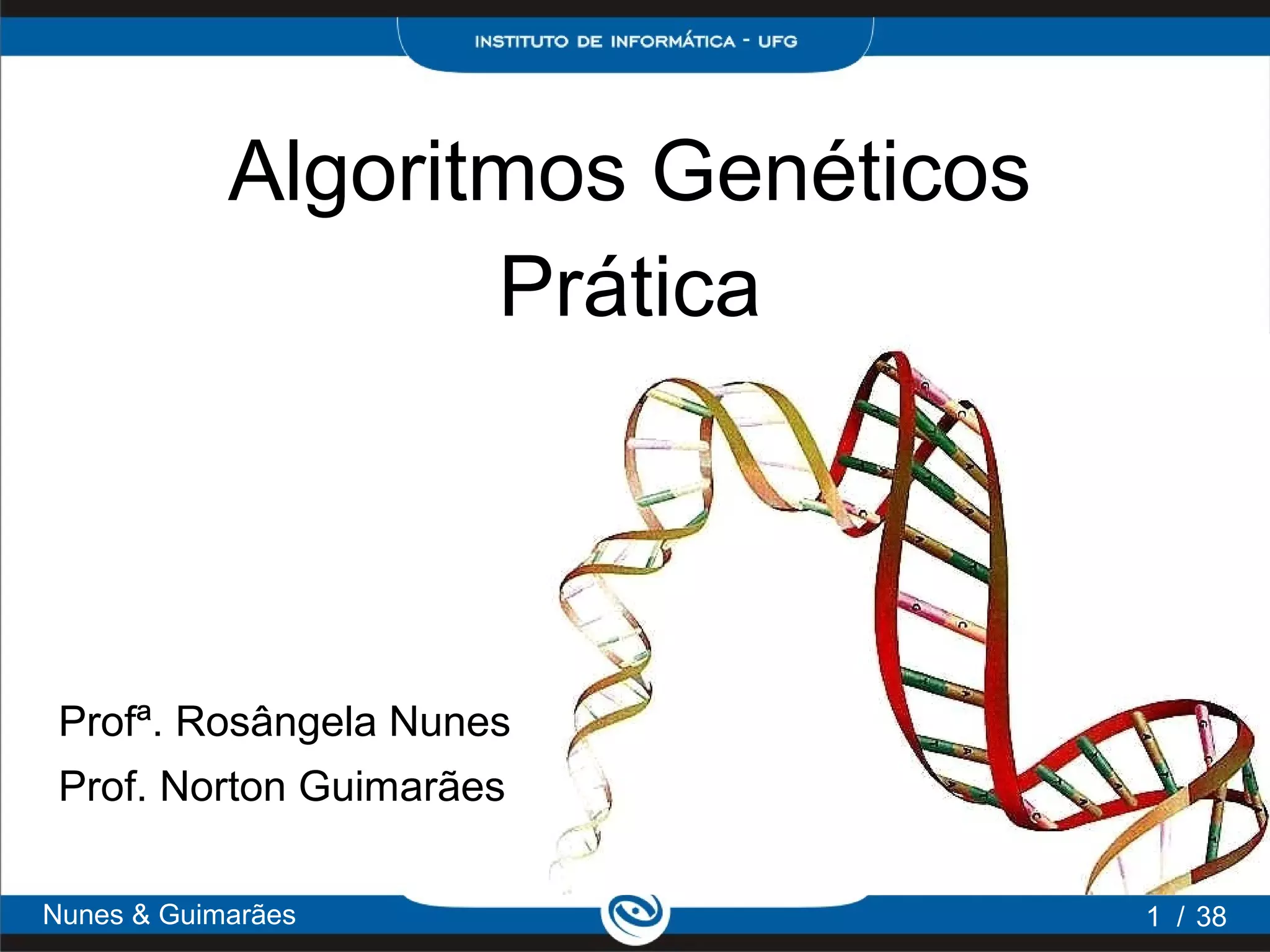 O documento apresenta uma introdução aos algoritmos genéticos e descreve dois problemas que serão resolvidos: o problema do caixeiro viajante e o tratamento quimioterápico, incluindo suas representações e soluções propostas utilizando técnicas de algoritmos genéticos como seleção, crossover e mutação.