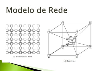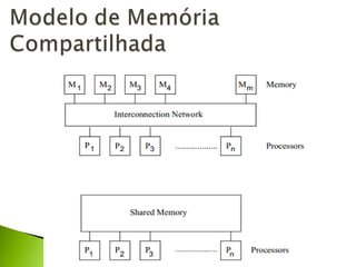 O documento discute a história da computação paralela desde Alan Turing, incluindo algoritmos paralelos, condições de corrida, e modelos de programação paralela como PVM e MPI. Também aborda arquiteturas de computação paralela como PRAM, redes de interconexão e modelos como BSP e CGM. Por fim, exemplifica aplicações da computação paralela em nuvens, sistemas de recomendação, robótica, jogos e previsão do tempo.